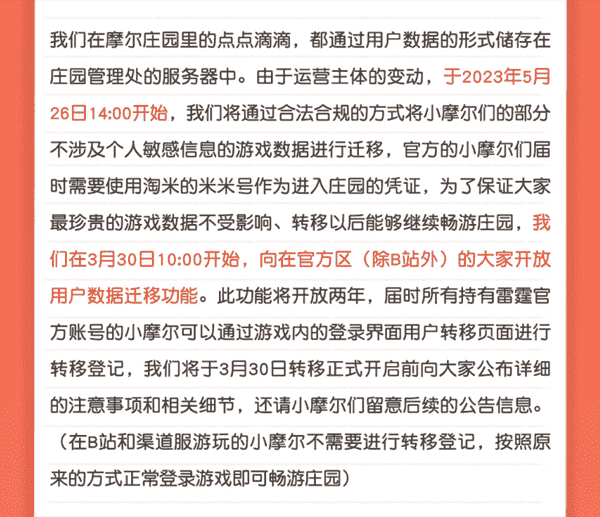 合作结束本就是开发方和代理方双方的事情,,,降低这件事情对玩家的影响,,,才是对所有珍视这段童年的摩尔玩家最好的呵护。。目前看来,,,,用户完全不用担心后续因无法登录游戏而造成任何数据上的损失,,,,只要及时进行账号转移,,,,就可以好好保留、、、、延续在庄园的痕迹和回忆,,,继续在庄园里做快乐的红鼻子小鼹鼠。。