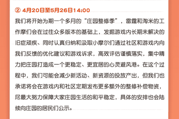合作的结束并不意味着这个童年IP的结束,,,对于《摩尔庄园》手游而言,,,,这是一个新阶段的开始。。。。后续游戏内将开启庄园重构计划,,会就以往遗留下来的BUG进行集中修复,,,并在游戏内和社区定期发布更多补偿物资。。。。
