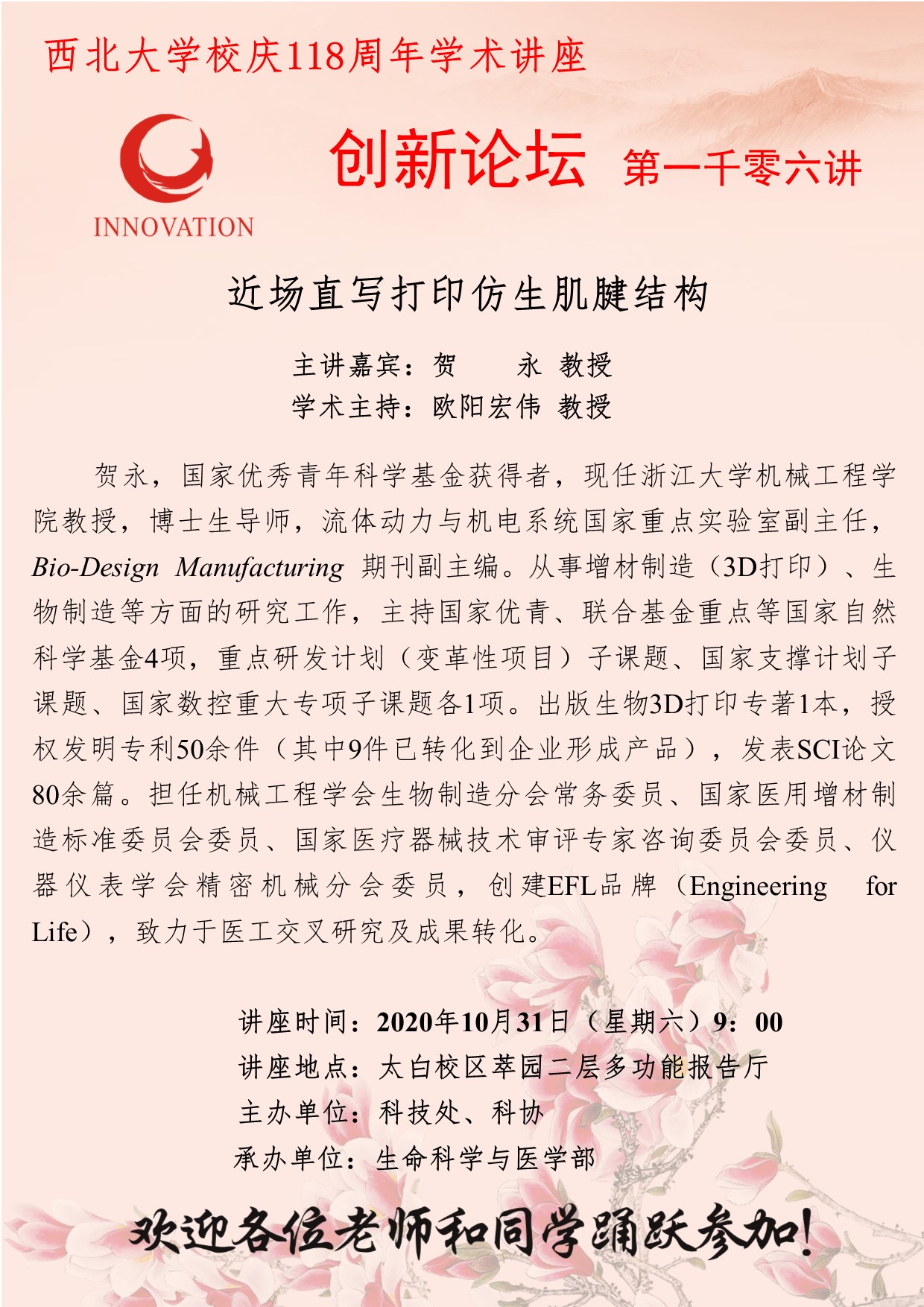 贺永 教授 必赢3003no1线路检测中心创新论坛第一千零六讲暨校庆118周年学术讲座:近场直写打印仿生肌腱结构 讲座时间 2020年10月31日(星期六)9:00 讲座地点 太白校区萃园二层多功能报告厅 讲座人介绍 贺永 教授 讲座内容