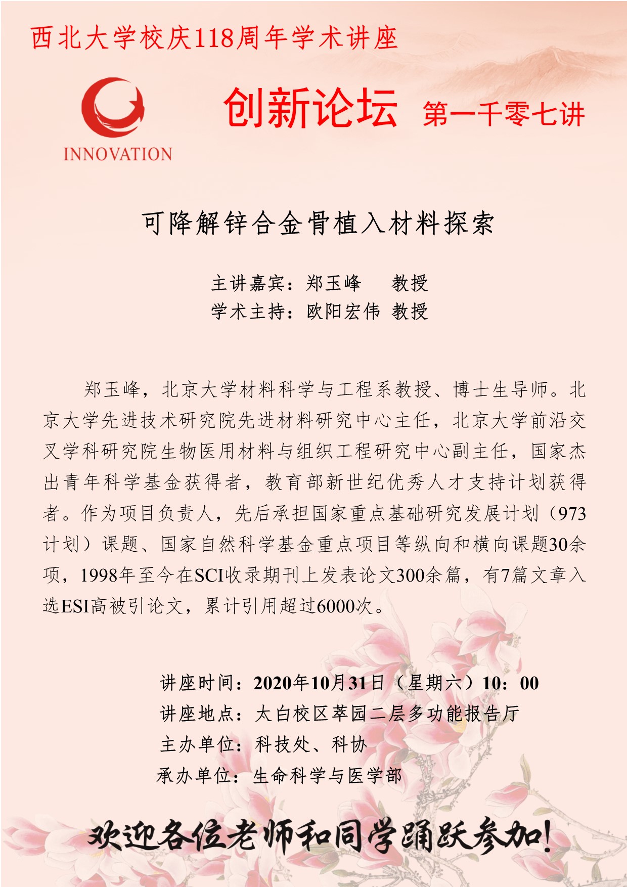 郑玉峰 教授 必赢3003no1线路检测中心创新论坛第一千零七讲暨校庆118周年学术讲座:可降解锌合金骨植入材料探索 讲座时间 2020年10月31日(星期六)10:00 讲座地点 太白校区萃园二层多功能报告厅 讲座人介绍 郑玉峰 教授 讲座内容