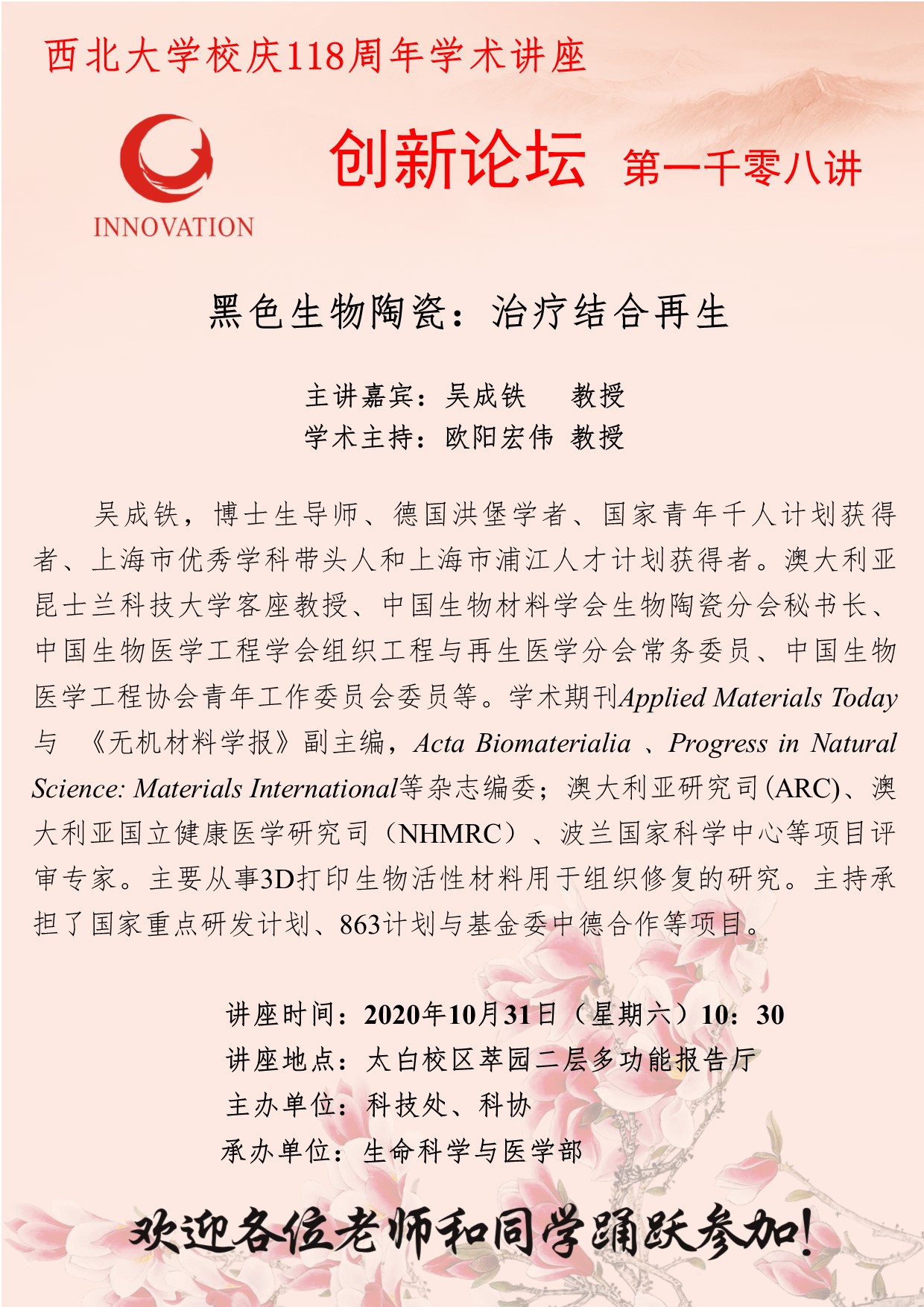 吴成铁 教授 必赢3003no1线路检测中心创新论坛第一千零八讲暨校庆118周年学术讲座:黑色生物陶瓷:治疗结合再生 讲座时间 2020年10月31日(星期六)10:30 讲座地点 太白校区萃园二层多功能报告厅 讲座人介绍 吴成铁 教授 讲座内容