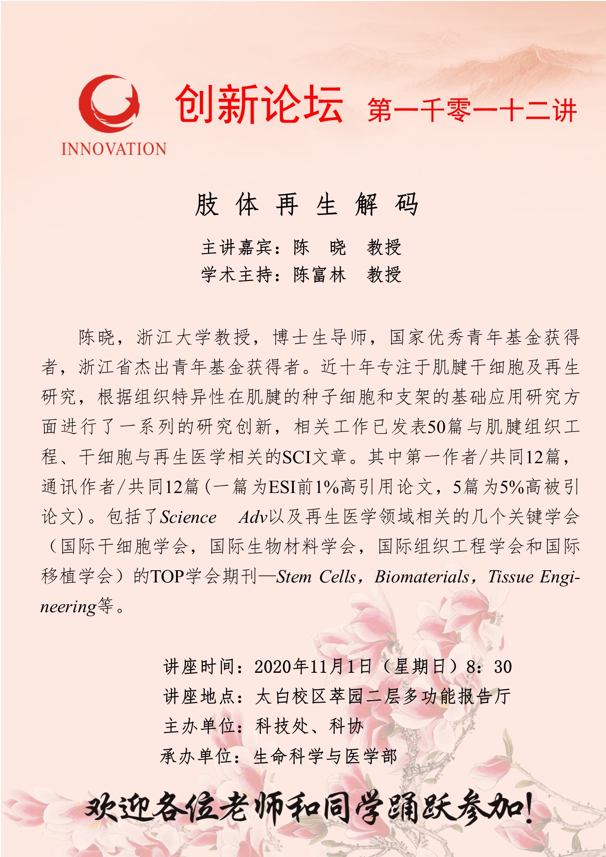 陈晓 教授 必赢3003no1线路检测中心创新论坛第一千零一十二讲:肢体再生解码 讲座时间 2020年11月1日(星期日)8:30 讲座地点 太白校区萃园二层多功能报告厅 讲座人介绍 陈晓 教授 讲座内容