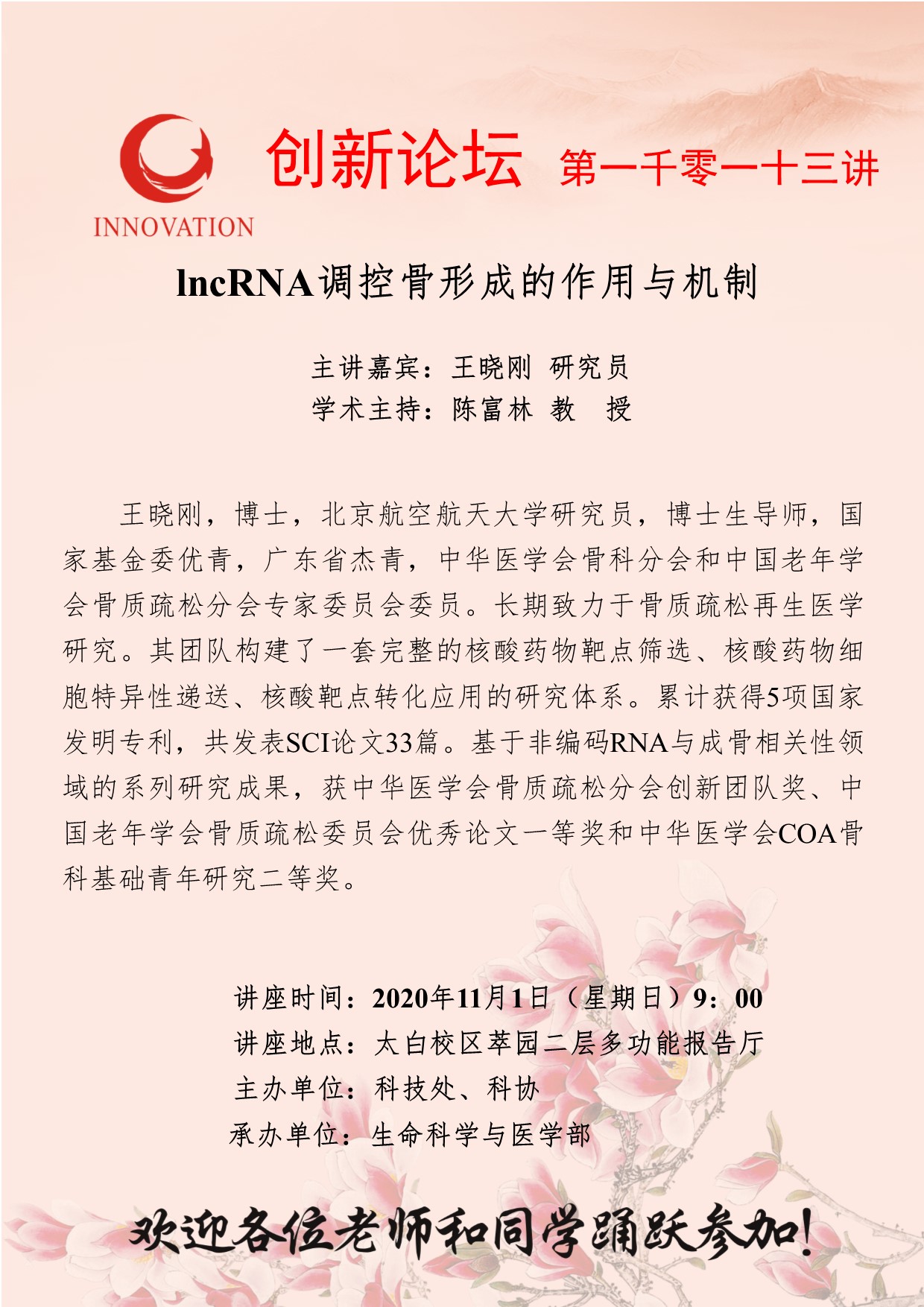王晓刚 研究员 必赢3003no1线路检测中心创新论坛第一千零一十三讲:lncRNA调控骨形成的作用与机制 讲座时间 2020年11月1日(星期日)9:00 讲座地点 太白校区萃园二层多功能报告厅 讲座人介绍 王晓刚 研究员 讲座内容