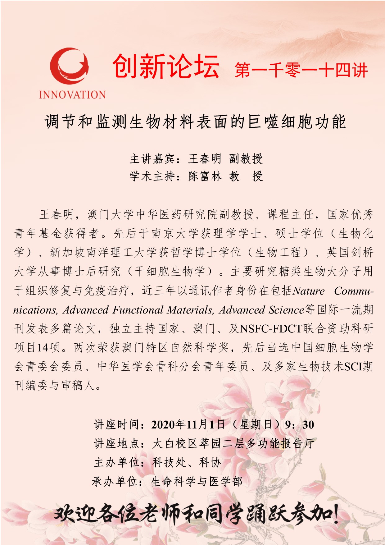王春明 副教授 必赢3003no1线路检测中心创新论坛第一千零一十四讲:调节和监测生物材料表面的巨噬细胞功能 讲座时间 2020年11月1日(星期日)9:30 讲座地点 太白校区萃园二层多功能报告厅 讲座人介绍 王春明 副教授 讲座内容