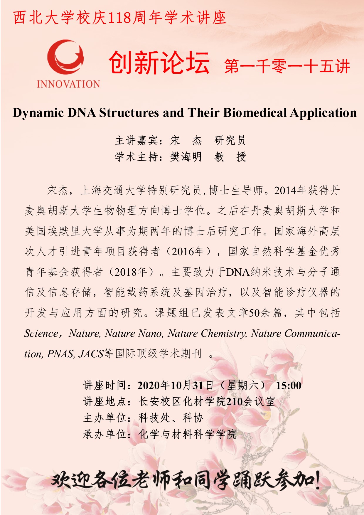 宋杰 研究员 必赢3003no1线路检测中心创新论坛第一千零一十五讲暨校庆118周年学术讲座:Dynamic DNA Structures and Their Biomedical Application 讲座时间 2020年10月31日(星期六)15:00 讲座地点 化学与材料科学学院210室 讲座人介绍 宋杰 研究员 讲座内容