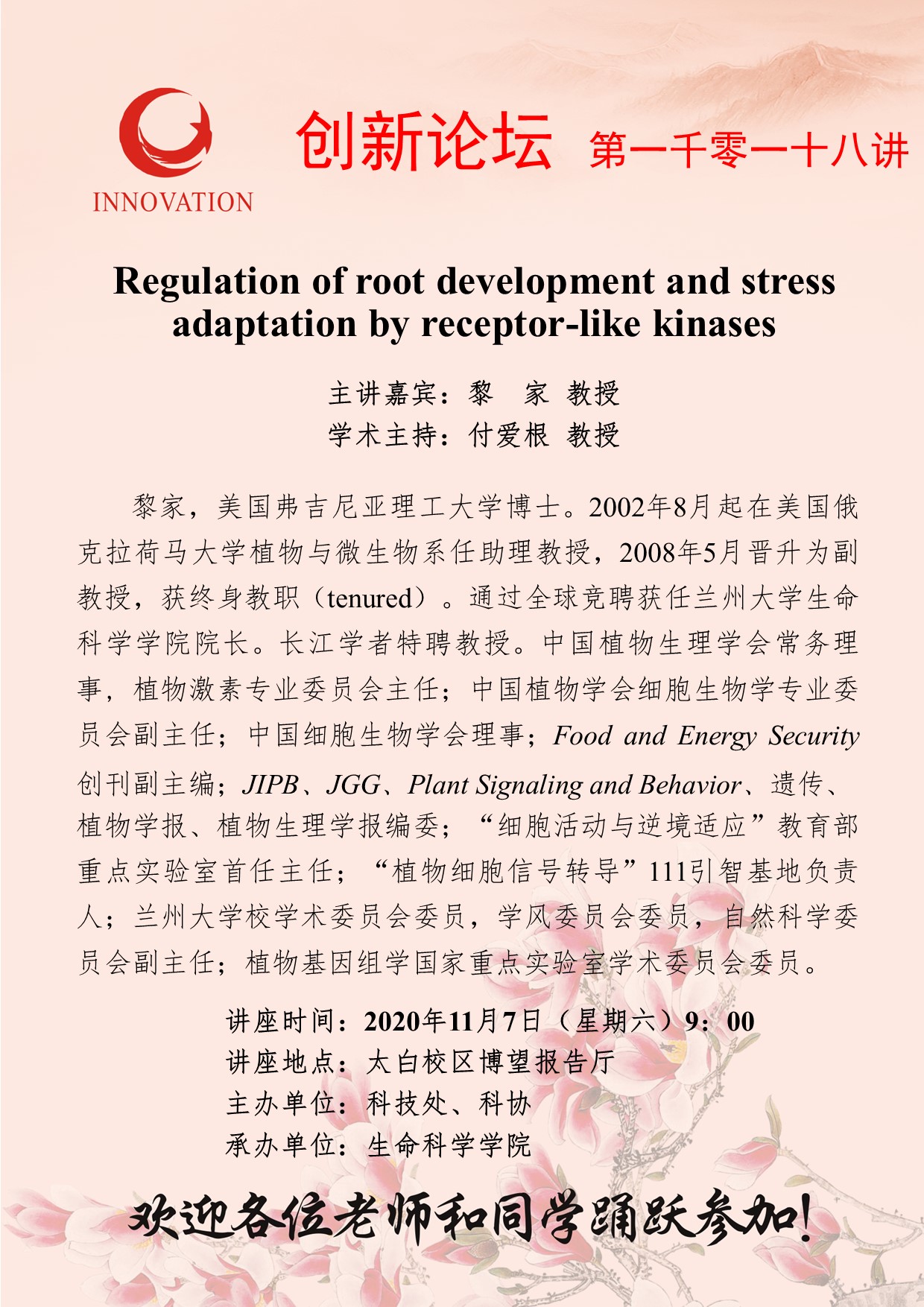 黎 家 教授 必赢3003no1线路检测中心创新论坛第一千零一十八讲:Regulation of root development and stress adaptation by receptor-like kinases 讲座时间 2020年11月7日(星期六)9:00 讲座地点 太白校区博望报告厅 讲座人介绍 黎 家 教授 讲座内容