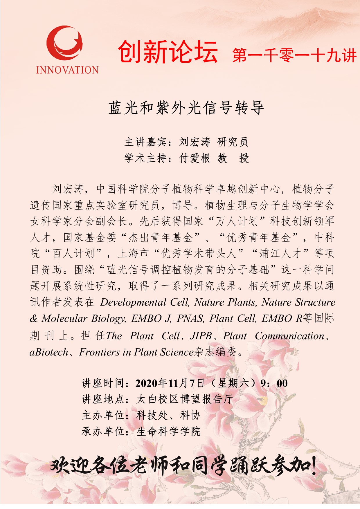 刘宏涛 研究员 必赢3003no1线路检测中心创新论坛第一千零一十九讲:蓝光和紫外光信号转导 讲座时间 2020年11月7日(星期六)9:00 讲座地点 太白校区博望报告厅 讲座人介绍 刘宏涛 研究员 讲座内容
