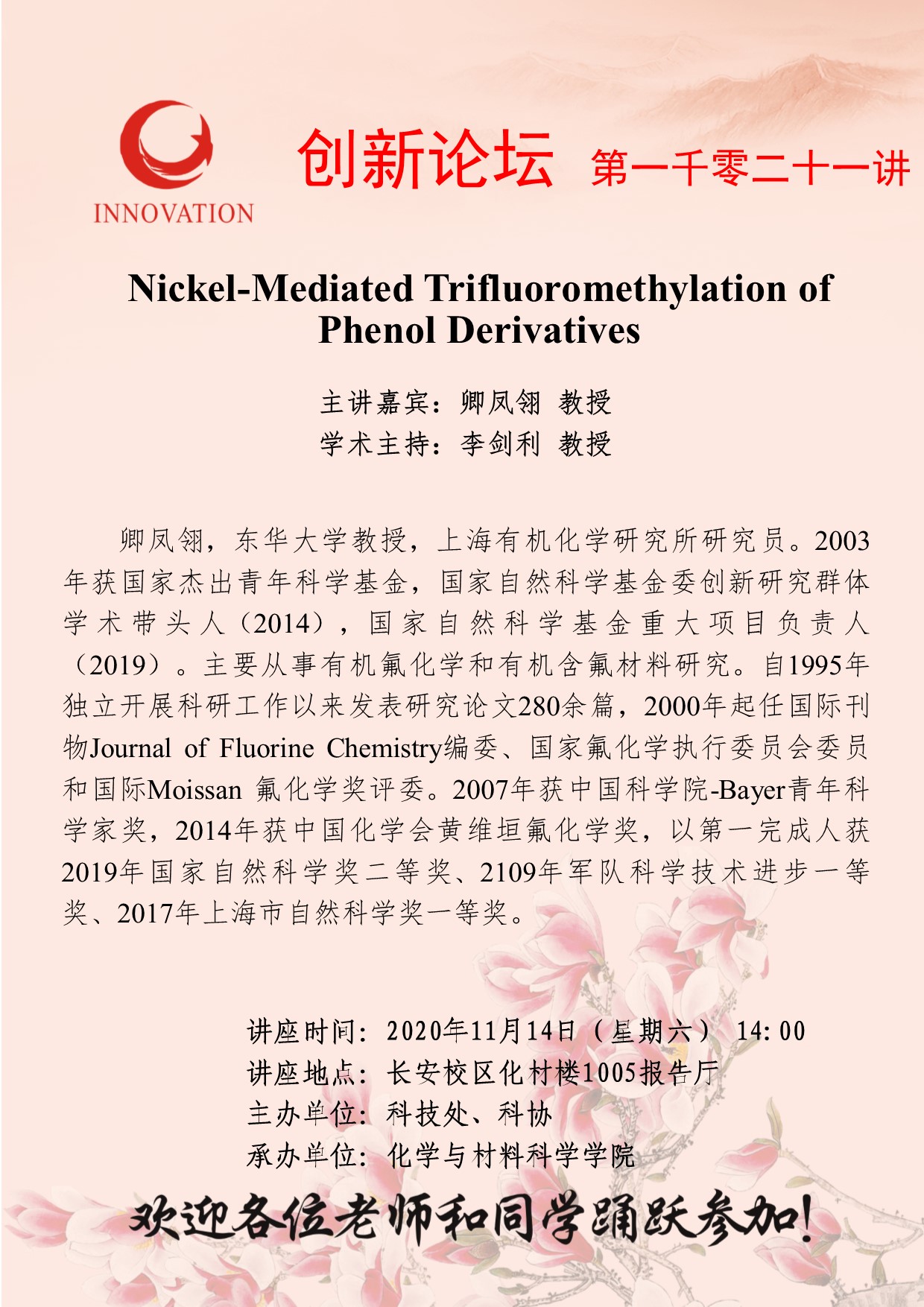 卿凤翎 教授 必赢3003no1线路检测中心创新论坛第一千零二十一讲:Nickel-Mediated Trifluoromethylation of Phenol Derivatives 讲座时间 2019年11月14日(星期六)14:00 讲座地点 长安校区化材楼1005报告厅 讲座人介绍 卿凤翎 教授 讲座内容