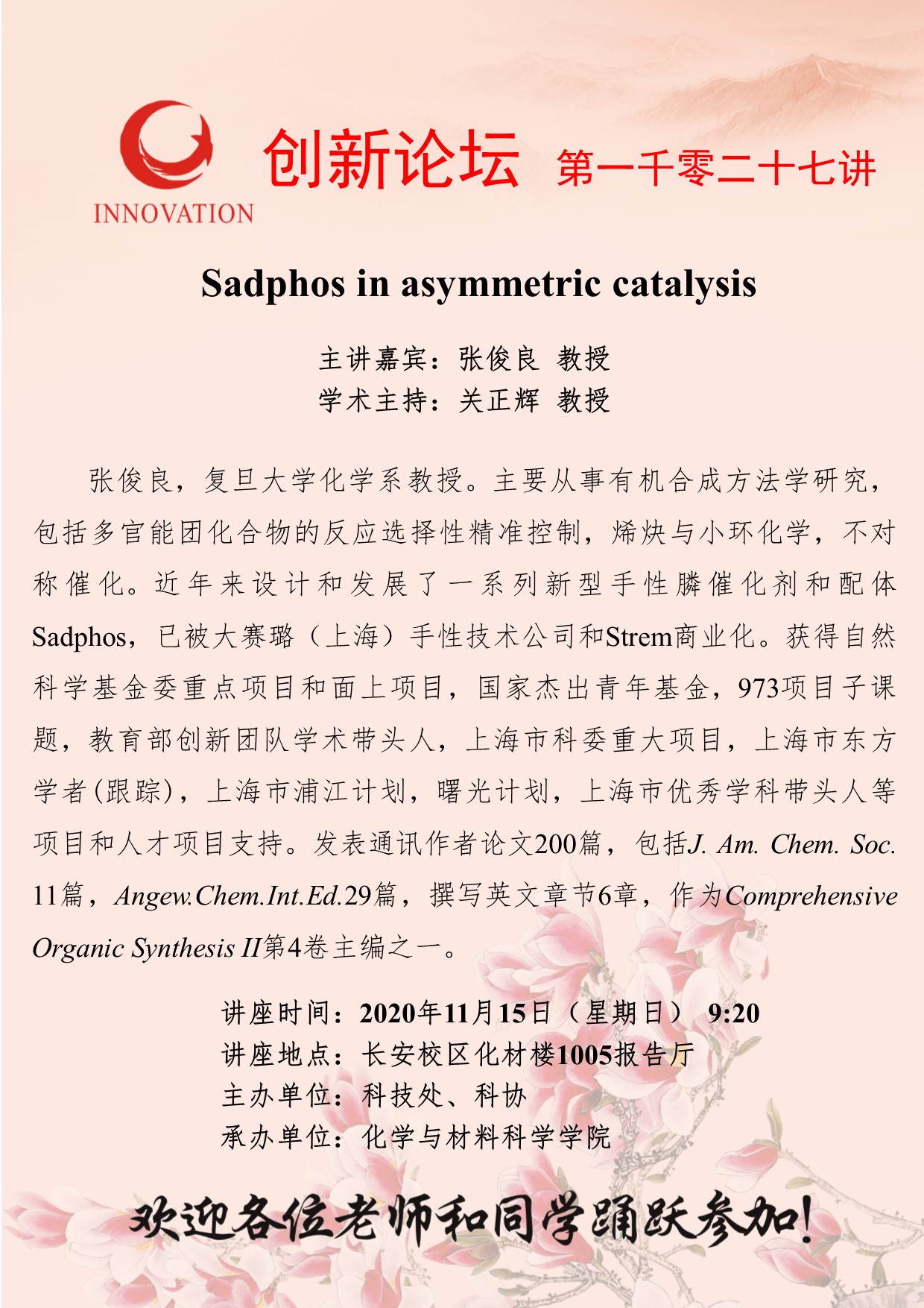 张俊良 教授 必赢3003no1线路检测中心创新论坛第一千零二十七讲:Sadphos in asymmetric catalysis 讲座时间 2020年11月15日(星期日)9:20 讲座地点 长安校区化材楼1005报告厅 讲座人介绍 张俊良 教授 讲座内容