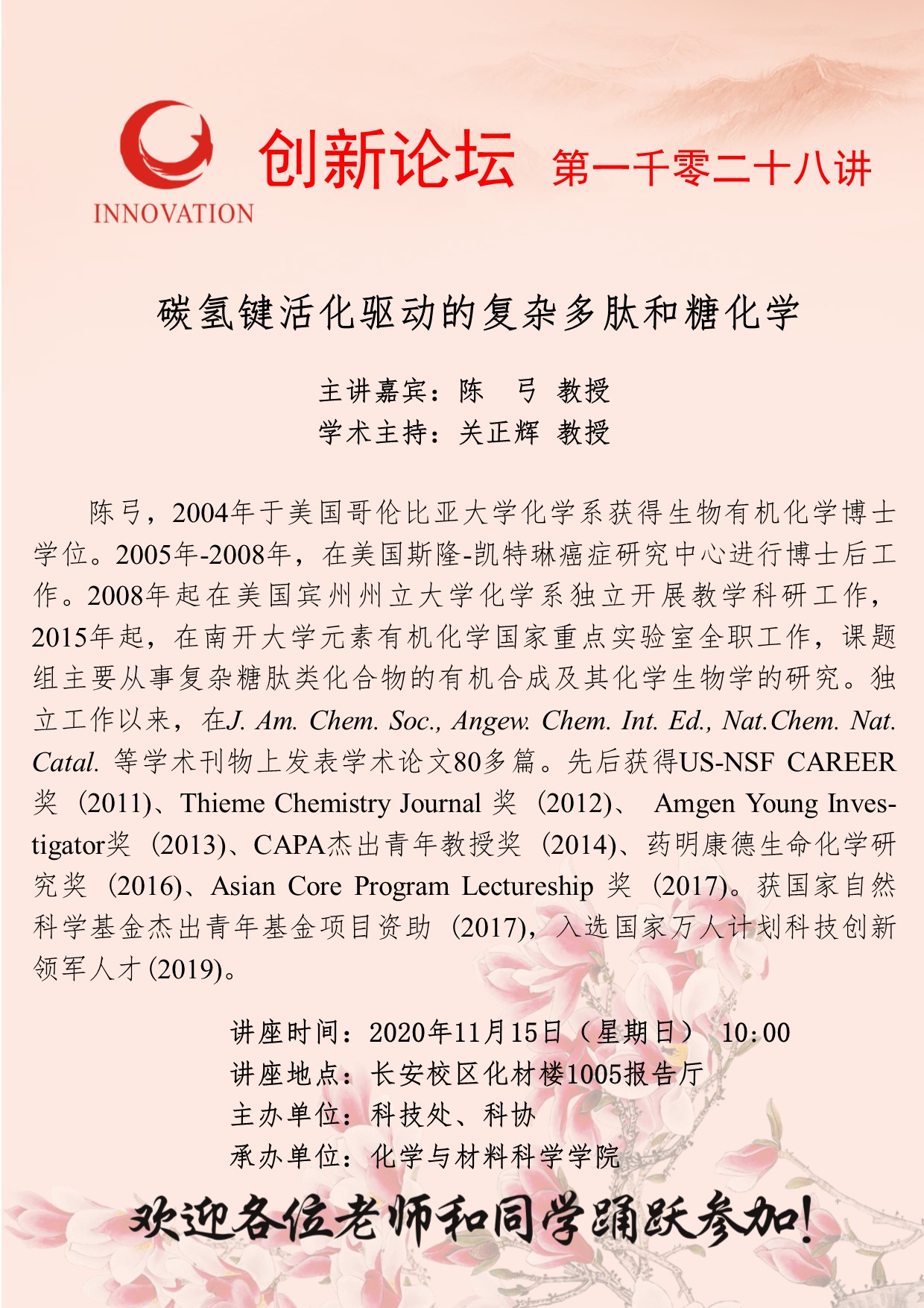 陈 弓 教授 必赢3003no1线路检测中心创新论坛第一千零二十八讲:碳氢键活化驱动的复杂多肽和糖化学 讲座时间 2020年 11月15日(星期日)10:00 讲座地点 长安校区化材楼1005报告厅 讲座人介绍 陈 弓 教授 讲座内容