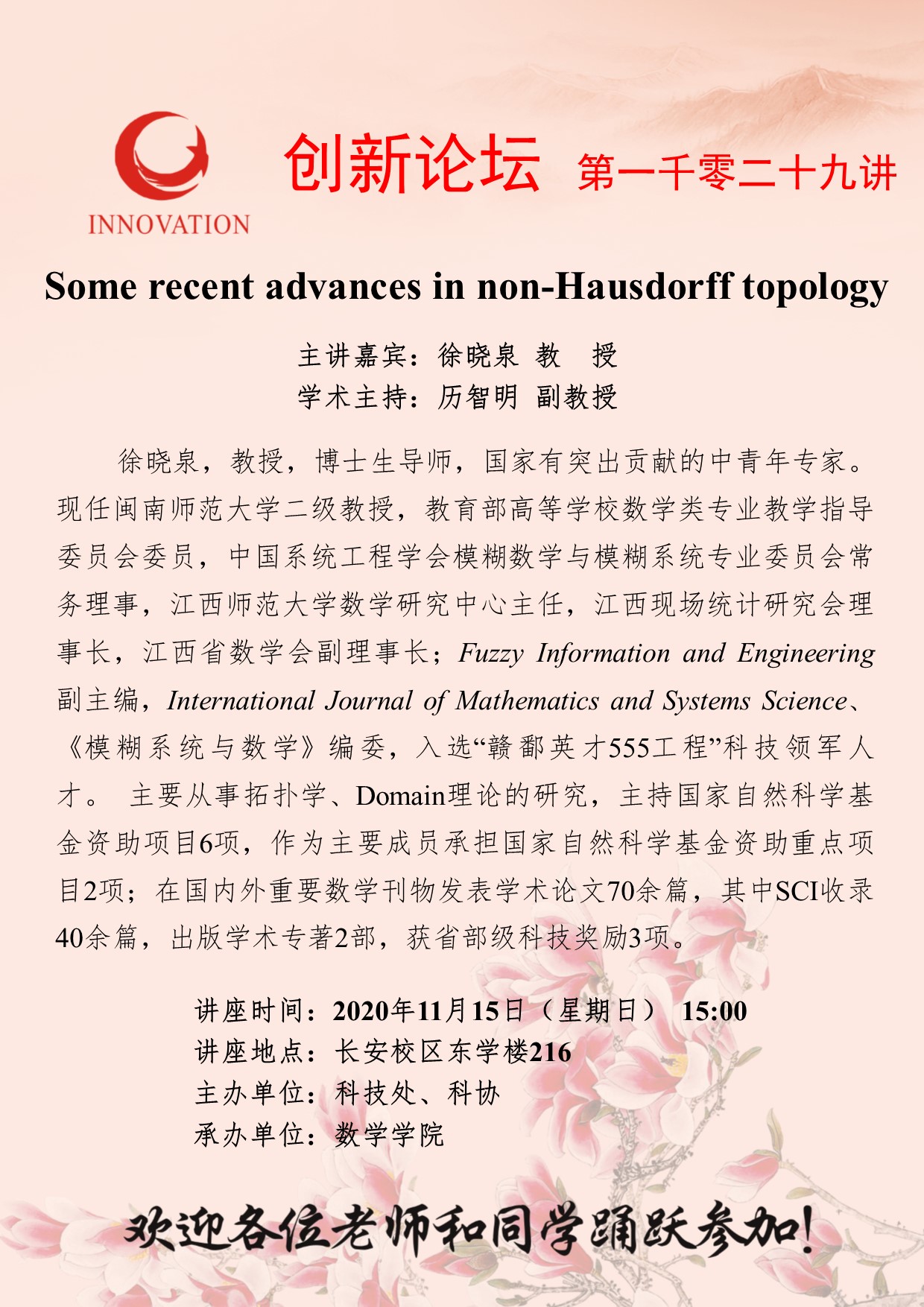 徐晓泉 教授 必赢3003no1线路检测中心创新论坛第一千零二十九讲:Some recent advances in non-Hausdorff topology 讲座时间 2020年11月15日(星期日) 15:00 讲座地点 长安校区东学楼216 讲座人介绍 徐晓泉 教授 讲座内容