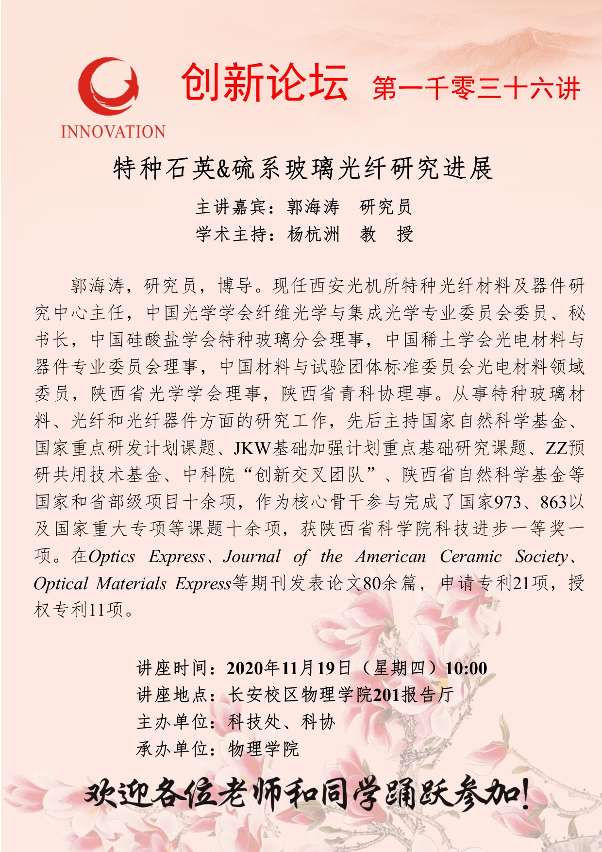 郭海涛 研究员 必赢3003no1线路检测中心创新论坛第一千零三十六讲:特种石英&硫系玻璃光纤研究进展 讲座时间 2020年11月19日(星期四)10:00 讲座地点 长安校区物理学院201报告厅 讲座人介绍 郭海涛 研究员 讲座内容