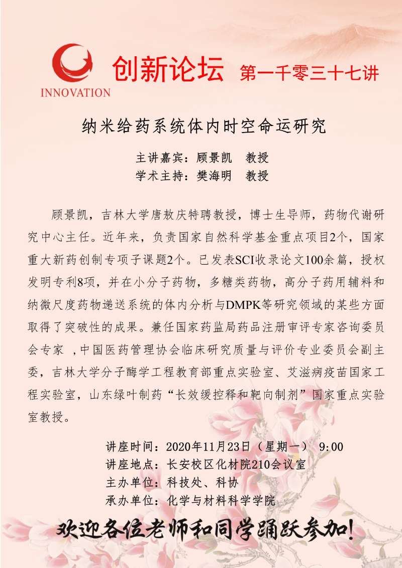 顾景凯 教授 必赢3003no1线路检测中心创新论坛第一千零三十七讲:纳米给药系统体内时空命运研究 讲座时间 2020年11月23日(星期一) 9:00 讲座地点 长安校区化材院210会议室 讲座人介绍 顾景凯 教授 讲座内容