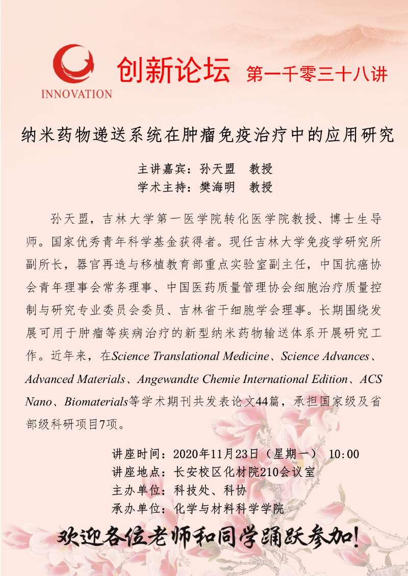 孙天盟 教授 必赢3003no1线路检测中心创新论坛第一千零三十八讲:纳米药物递送系统在肿瘤免疫治疗中的应用研究 讲座时间 2020年11月23日(星期一) 10:00 讲座地点 长安校区化材院210会议室 讲座人介绍 孙天盟 教授 讲座内容