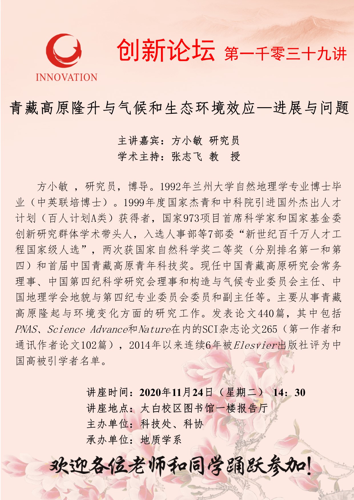 方小敏 研究员 必赢3003no1线路检测中心创新论坛第一千零三十九讲:青藏高原隆升与气候和生态环境效应—进展与问题 讲座时间 2020年11月24日(星期二)14:30 讲座地点 太白校区图书馆一楼报告厅 讲座人介绍 方小敏 研究员 讲座内容
