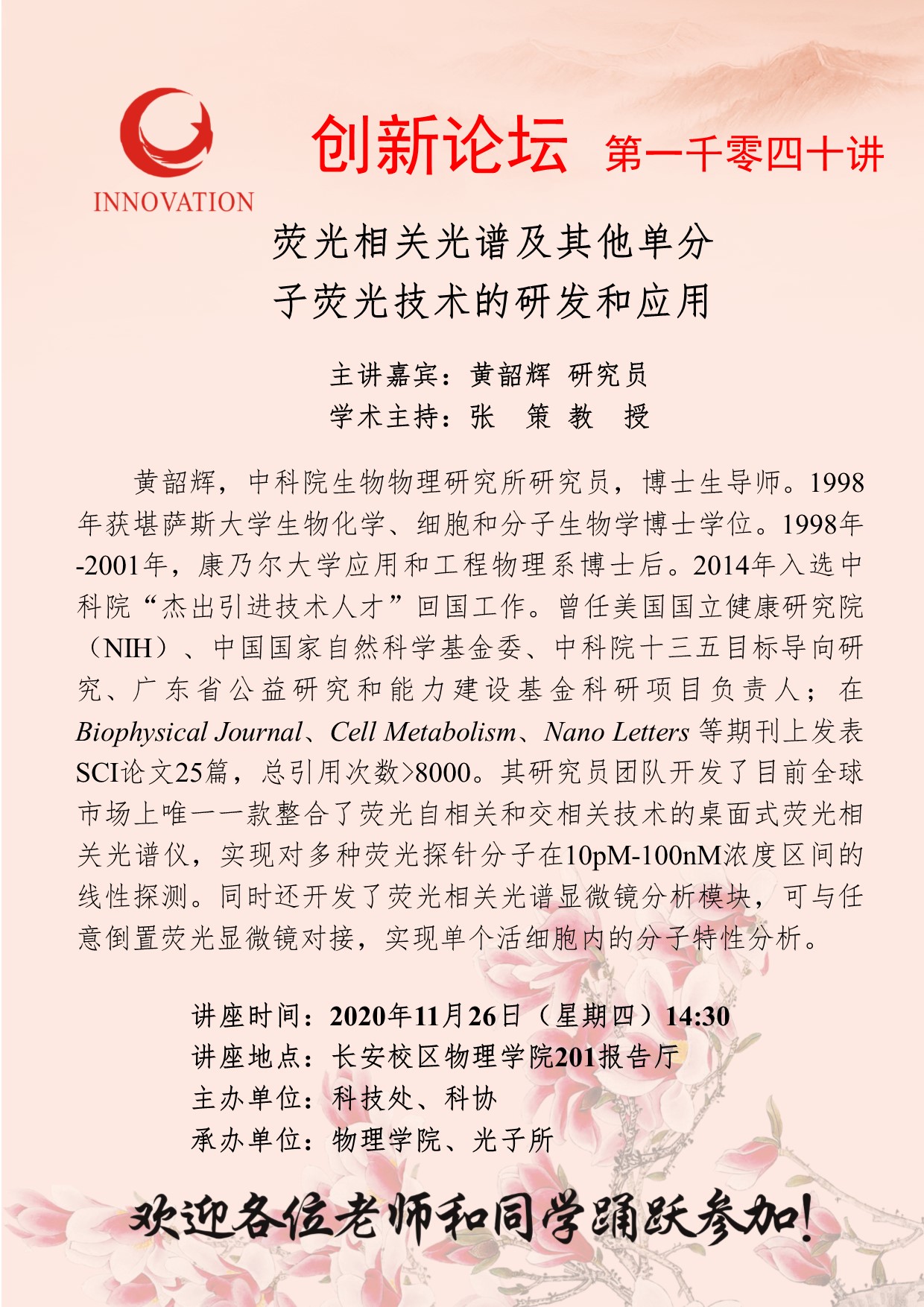 黄韶辉 研究员 必赢3003no1线路检测中心创新论坛第一千零四十讲:荧光相关光谱及其他单分子荧光技术的研发和应用 讲座时间 2020年11月26日(星期四)14:30 讲座地点 长安校区物理学院201报告厅 讲座人介绍 黄韶辉 研究员 讲座内容