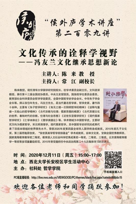 陈 来 教 授 侯外庐学术讲座第二百零九讲:文化传承的诠释学视野——冯友兰文化继承思想新论 讲座时间 2020年12月11日(周五)15:00-17:00 讲座地点 必赢3003no1线路检测中心长安校区学生活动中心 讲座人介绍 陈 来 教 授 讲座内容