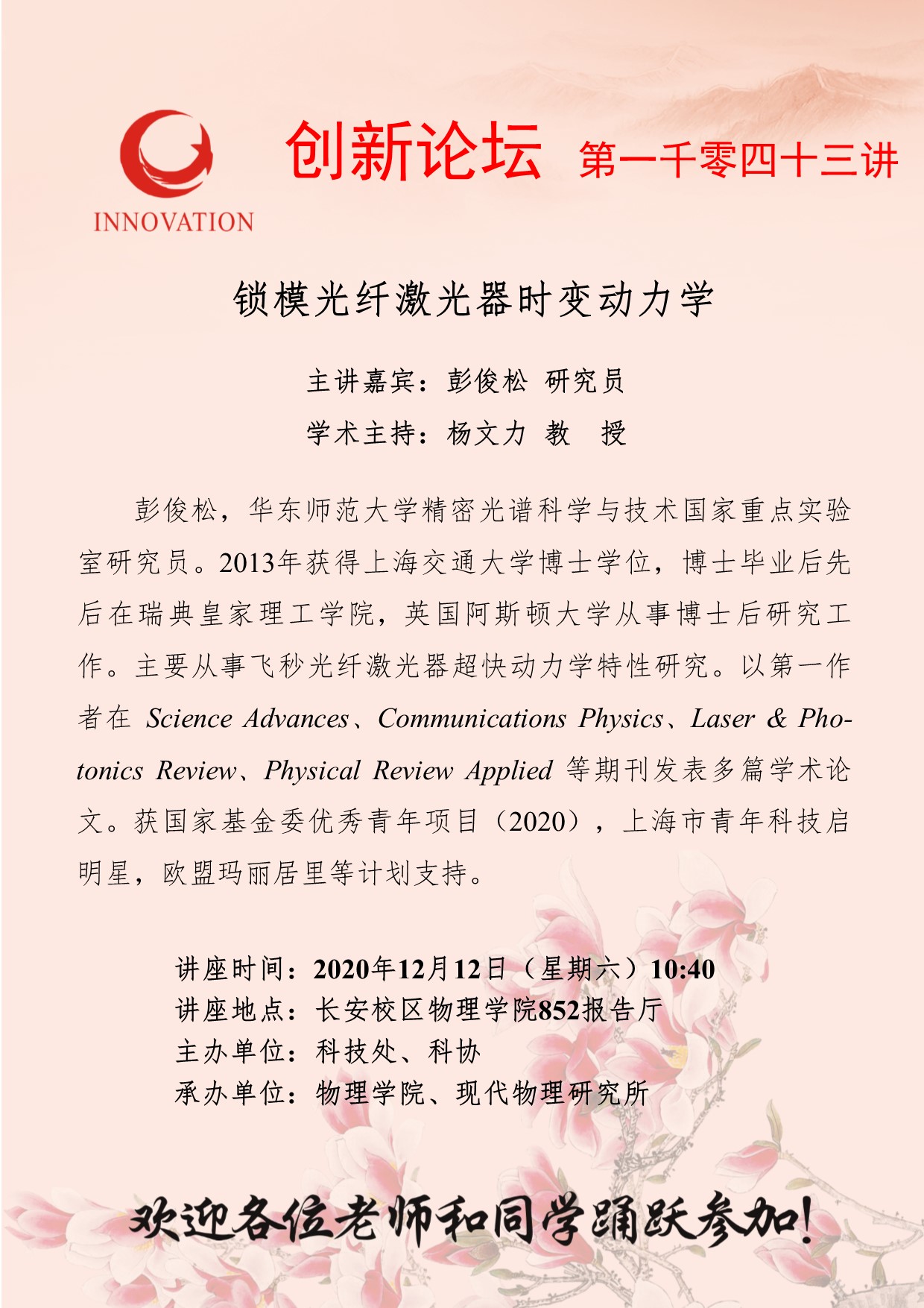 彭俊松 研究员 必赢3003no1线路检测中心创新论坛第一千零四十三讲:锁模光纤激光器时变动力学 讲座时间 2020年12月12日(星期六)10:40 讲座地点 长安校区物理学院852报告厅 讲座人介绍 彭俊松 研究员 讲座内容