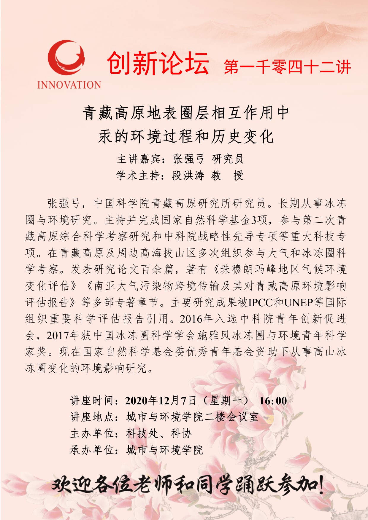 张强弓 研究员 必赢3003no1线路检测中心创新论坛第一千零四十二讲:青藏高原地表圈层相互作用中汞的环境过程和历史变化 讲座时间 2020年12月7日(星期一) 16:00 讲座地点 城市与环境学院二楼会议室 讲座人介绍 张强弓 研究员 讲座内容