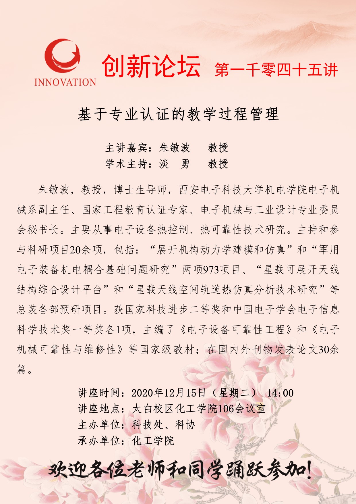 朱敏波 教授 必赢3003no1线路检测中心创新论坛第一千零四十五讲:基于专业认证的教学过程管理 讲座时间 2020年12月15日(星期二) 14:00 讲座地点 太白校区化工学院106会议室 讲座人介绍 朱敏波 教授 讲座内容
