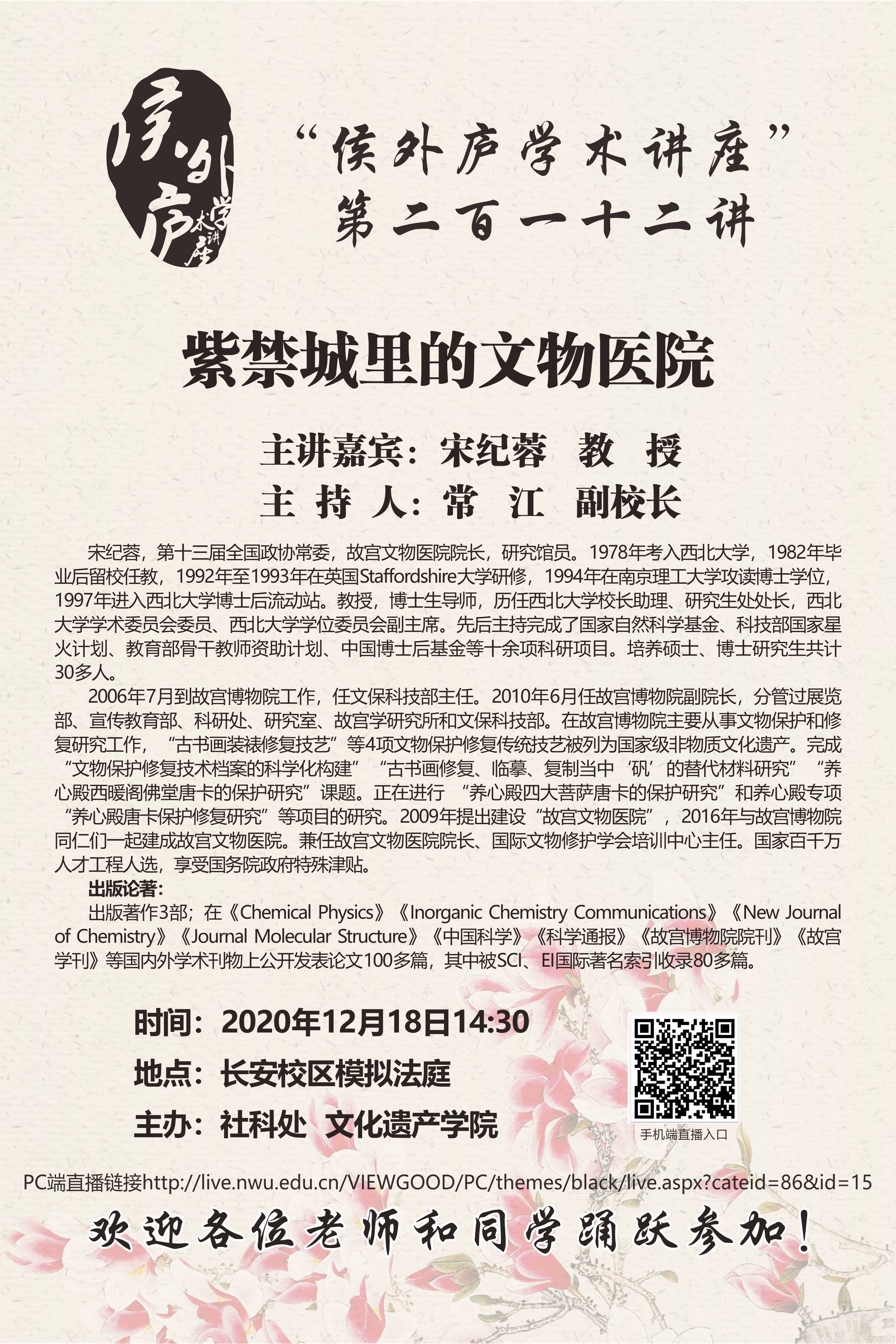 宋纪蓉 教授 “侯外庐学术讲座”第二百一十二讲:紫禁城里的文物医院 讲座时间 2020年12月18日(周五)14:30 讲座地点 必赢3003no1线路检测中心长安校区模拟法庭 讲座人介绍 宋纪蓉 教授 讲座内容