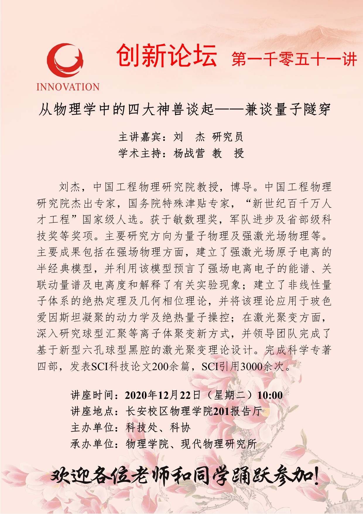 刘 杰 研究员 必赢3003no1线路检测中心创新论坛第一千零五十一讲:从物理学中的四大神兽谈起——兼谈量子隧穿 讲座时间 2020年12月22日(星期二)10:00 讲座地点 长安校区物理学院201报告厅 讲座人介绍 刘 杰 研究员 讲座内容