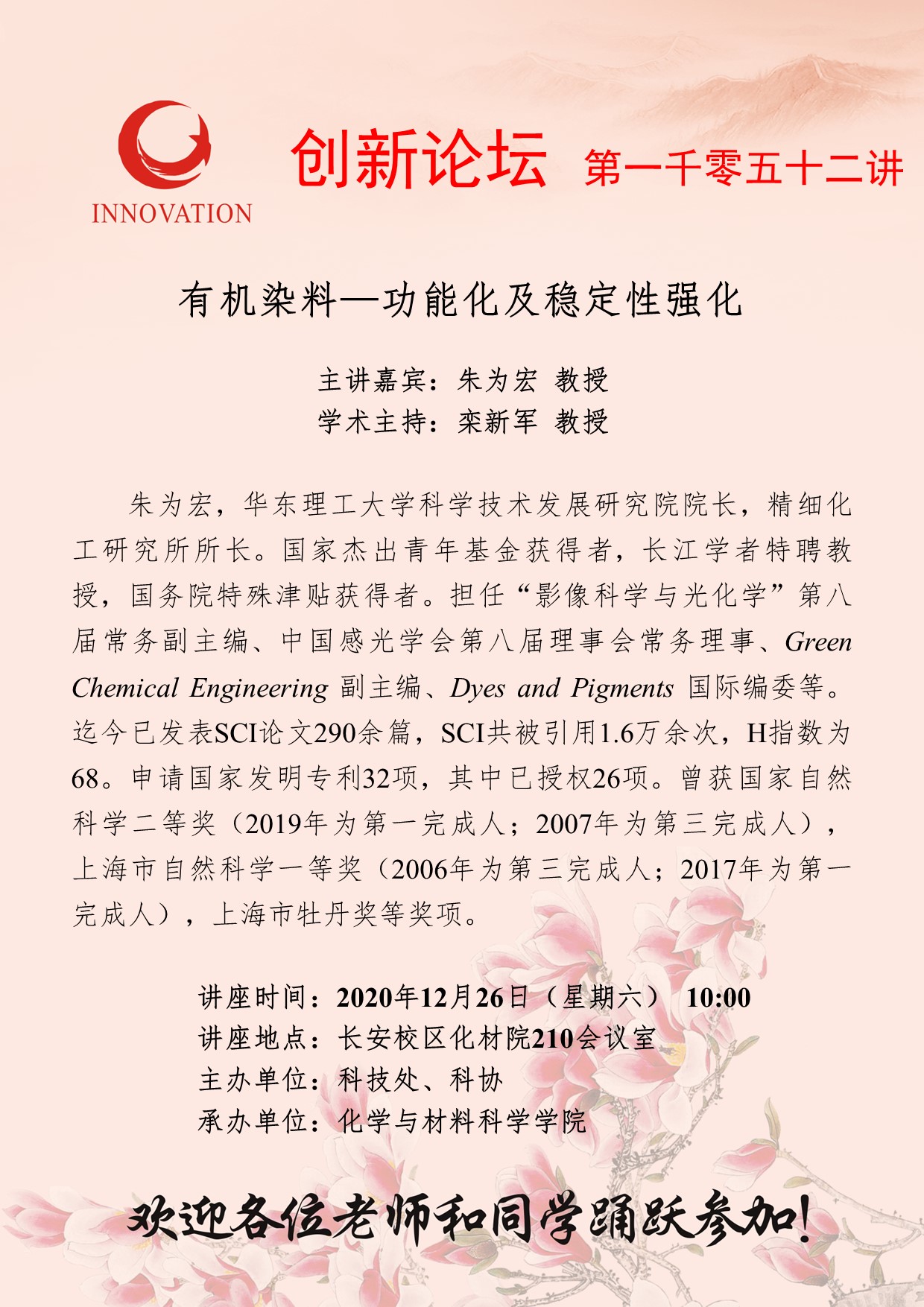 朱为宏 教授 必赢3003no1线路检测中心创新论坛第一千零五十二讲: 有机染料—功能化及稳定性强化 讲座时间 2020年12月26日(星期六) 10:00 讲座地点 长安校区化材院210会议室 讲座人介绍 朱为宏 教授 讲座内容