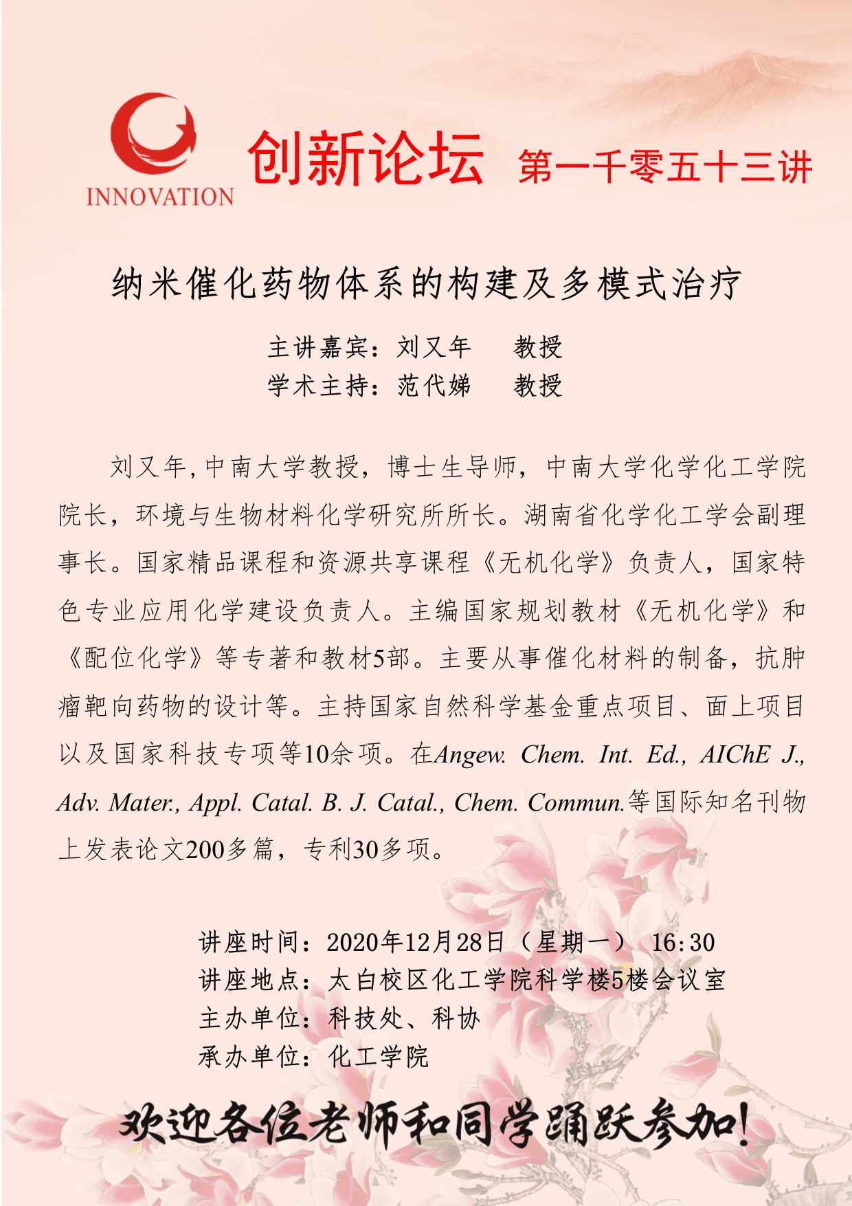 刘又年 教授 必赢3003no1线路检测中心创新论坛第一千零五十三讲:纳米催化药物体系的构建及多模式治疗 讲座时间 2020年12月28日(星期一) 16:30 讲座地点 太白校区化工学院科学楼5楼会议室 讲座人介绍 刘又年 教授 讲座内容