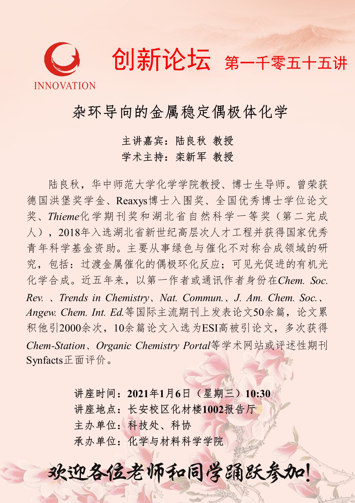 陆良秋 教授 必赢3003no1线路检测中心创新论坛第一千零五十五讲:杂环导向的金属稳定偶极体化学 讲座时间 2021年1月6日(星期三)10:30 讲座地点 长安校区化材楼1002报告厅 讲座人介绍 陆良秋 教授 讲座内容