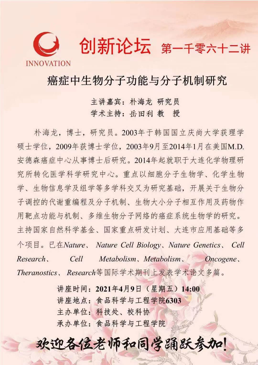 朴海龙 研究员 必赢3003no1线路检测中心创新论坛第一千零六十二讲:癌症中生物分子功能与分子机制研究 讲座时间 2021年4月9日(星期五)14:00 讲座地点 食品科学与工程学院6303 讲座人介绍 朴海龙 研究员 讲座内容