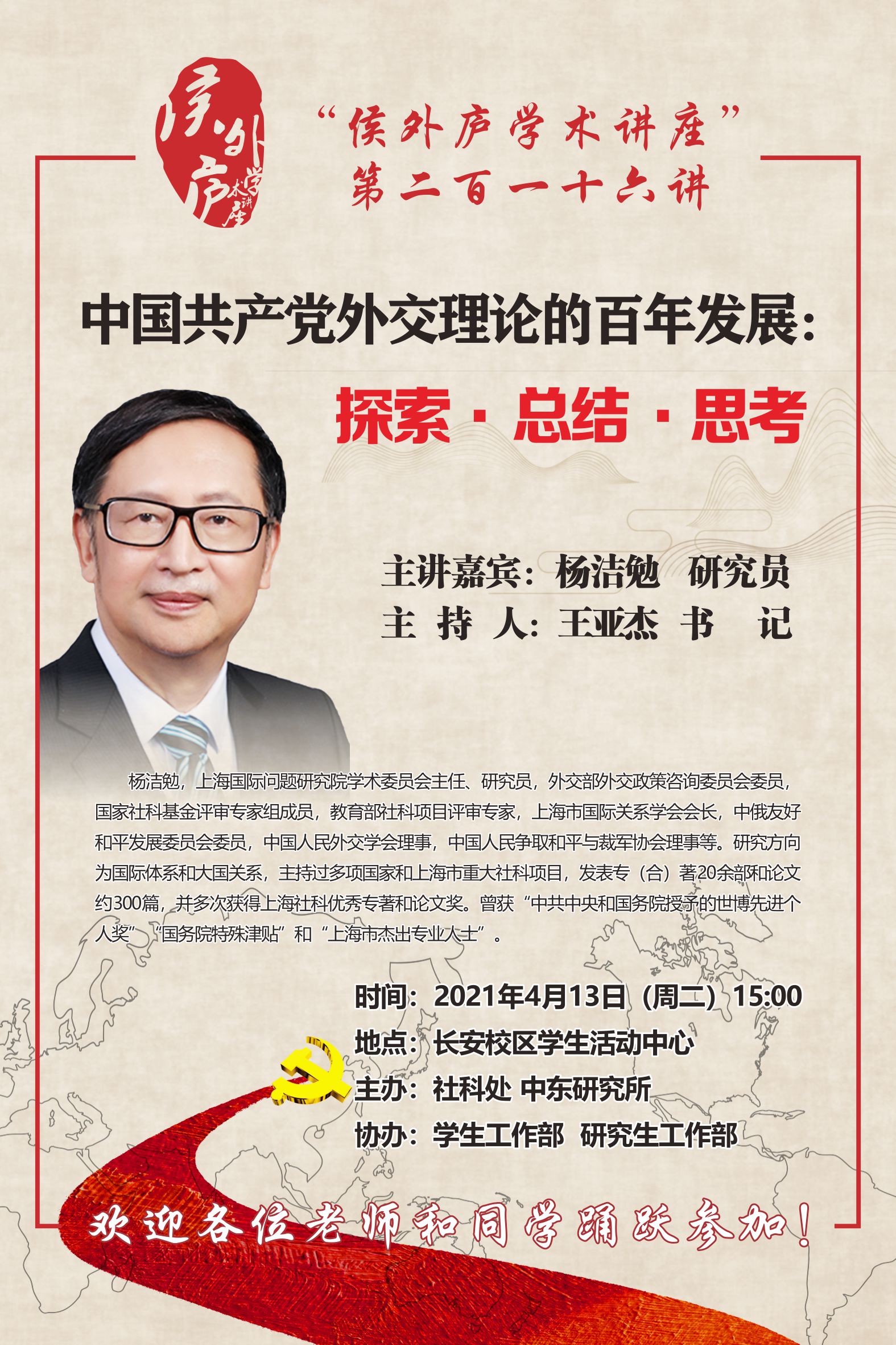 杨洁勉 研究员 侯外庐学术讲座第二百一十六讲:中国共产党外交理论的百年发展:探索·总结·思考 讲座时间 2021年4月13日(周二)15:00 讲座地点 长安校区学生活动中心 讲座人介绍 杨洁勉 研究员 讲座内容 ··