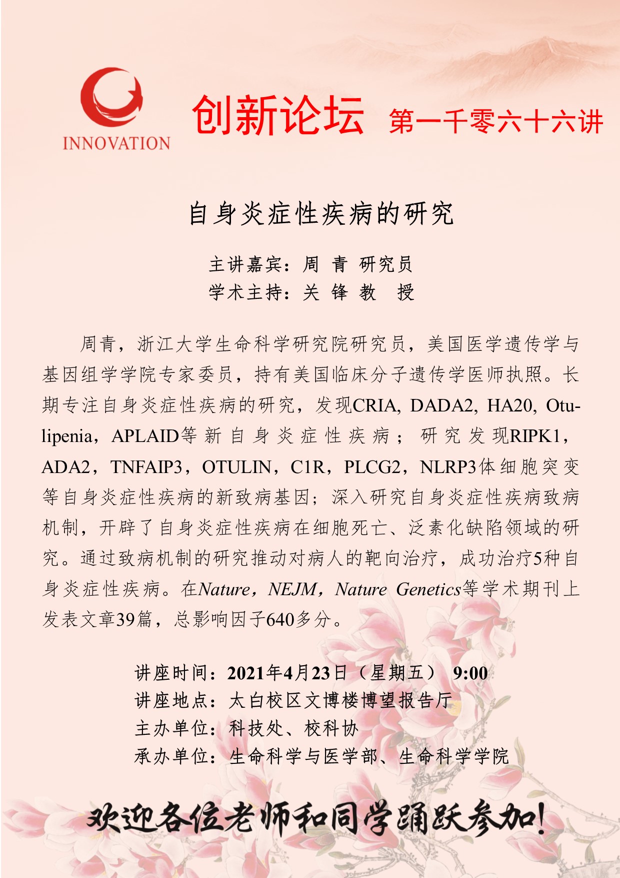 周 青 研究员 必赢3003no1线路检测中心创新论坛第一千零六十六讲:自身炎症性疾病的研究 讲座时间 2021年4月23日(星期五) 9:00 讲座地点 太白校区文博楼博望报告厅 讲座人介绍 周 青 研究员 讲座内容