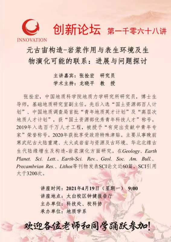 张拴宏 研究员 必赢3003no1线路检测中心创新论坛第一千零六十八讲:元古宙构造-岩浆作用与表生环境及生物演化可能的联系:进展与问题探讨 讲座时间 2021年4月19日(星期一) 9:00 讲座地点 太白校区钟健报告厅 讲座人介绍 张拴宏 研究员 讲座内容