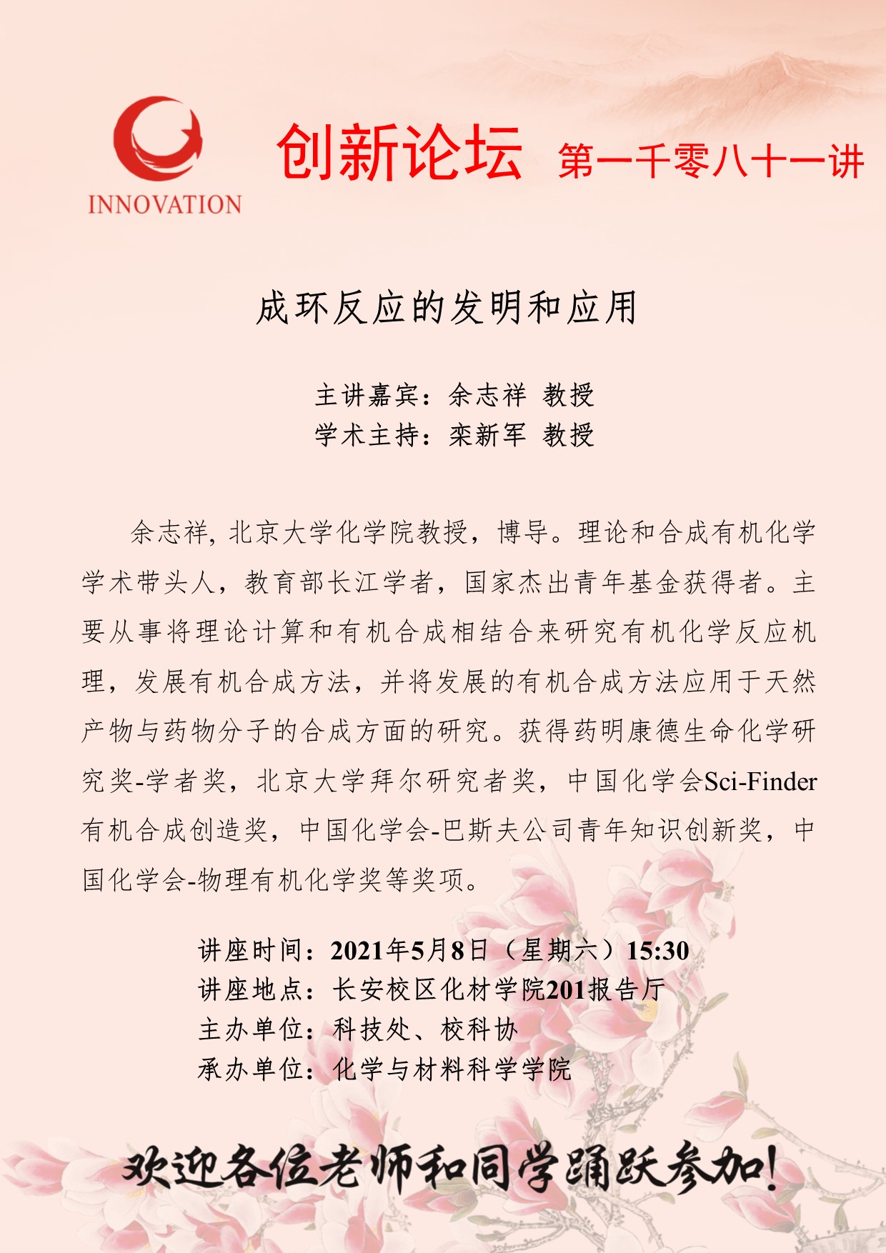 余志祥 教授 必赢3003no1线路检测中心创新论坛第一千零八十一讲:成环反应的发明和应用 讲座时间 2021年5月8日(星期六)15:30 讲座地点 长安校区化材学院201报告厅 讲座人介绍 余志祥 教授 讲座内容