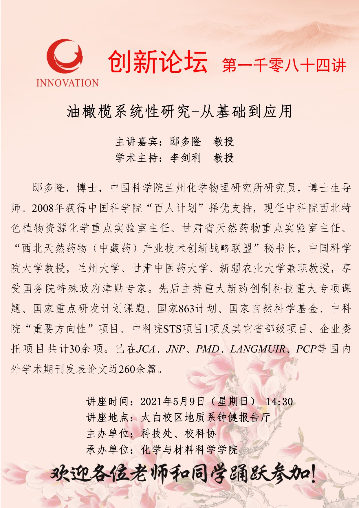 邸多隆 教授 必赢3003no1线路检测中心创新论坛第一千零八十四讲:油橄榄系统性研究-从基础到应用 讲座时间 2021年5月9日(星期日) 14:30 讲座地点 太白校区地质系钟健报告厅 讲座人介绍 邸多隆 教授 讲座内容
