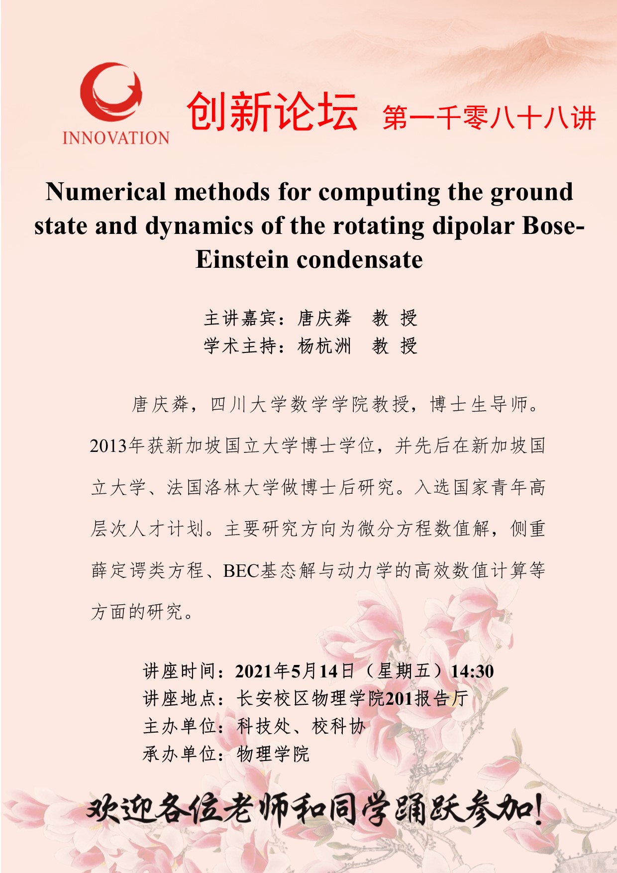 唐庆粦 教 授 必赢3003no1线路检测中心创新论坛第一千零八十八讲:Numerical methods for computing the ground state and dynamics of the rotating dipolar Bose-Einstein condensate 讲座时间 2021年5月14日(星期五)14:30 讲座地点 长安校区物理学院201报告厅 讲座人介绍 唐庆粦 教 授 讲座内容