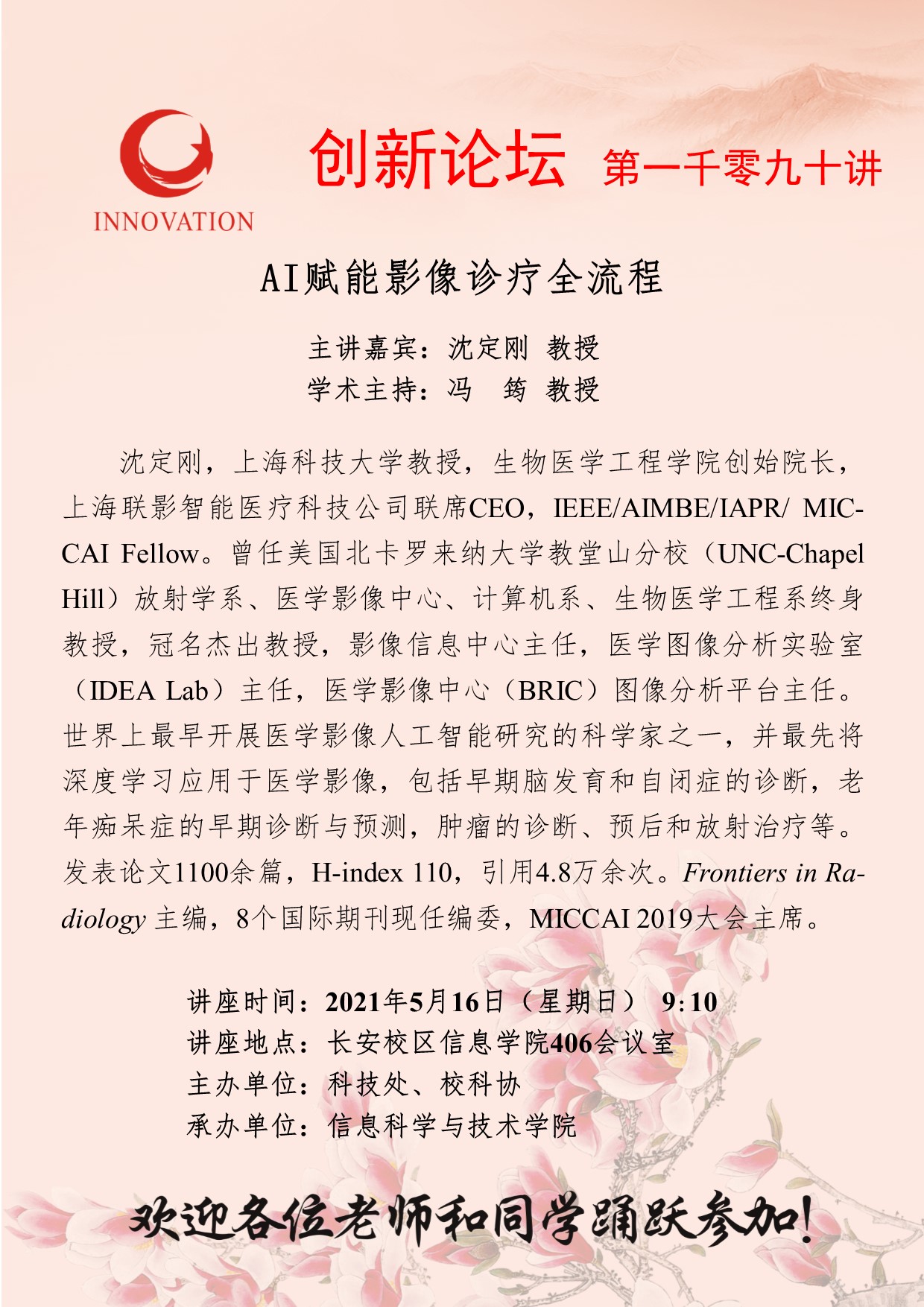 沈定刚 教授 必赢3003no1线路检测中心创新论坛第一千零九十讲:AI赋能影像诊疗全流程 讲座时间 2021年5月16日(星期日) 9:10 讲座地点 长安校区信息学院406会议室 讲座人介绍 沈定刚 教授 讲座内容