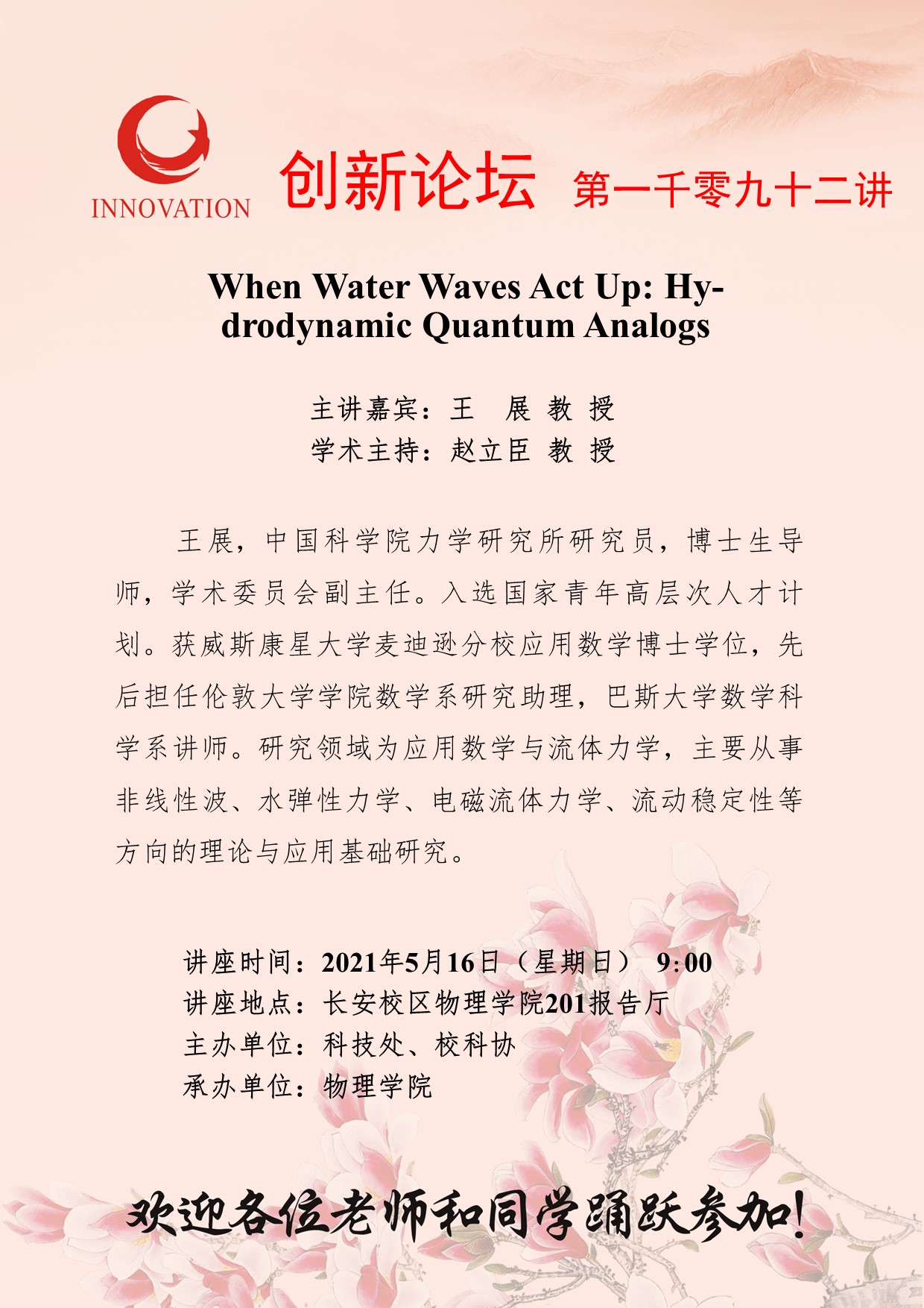 王 展 教 授 必赢3003no1线路检测中心创新论坛第一千零九十二讲:When Water Waves Act Up: Hydrodynamic Quantum Analogs 讲座时间 2021年5月16日(星期日) 9:00 讲座地点 长安校区物理学院201报告厅 讲座人介绍 王 展 教 授 讲座内容