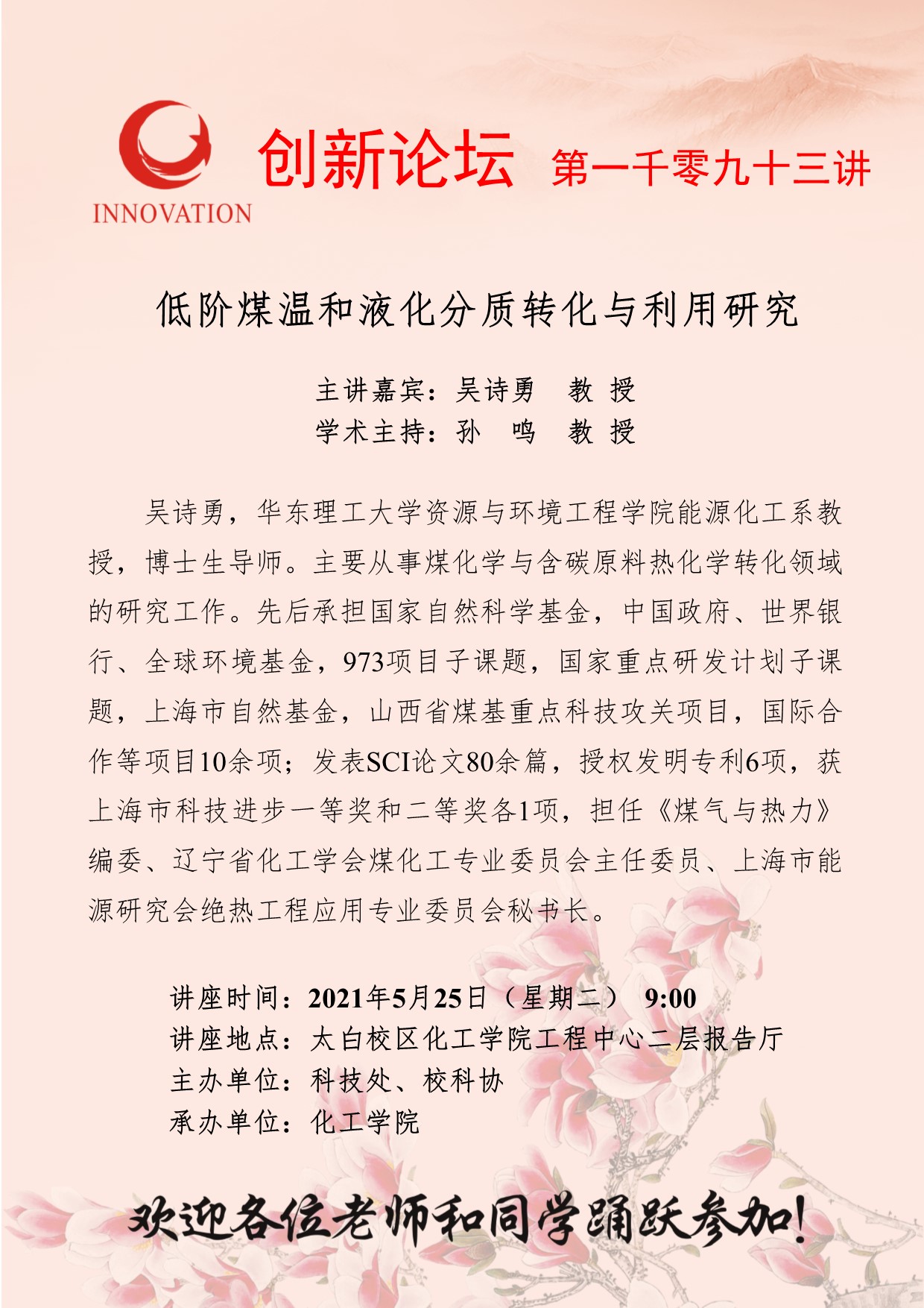吴诗勇 教 授 必赢3003no1线路检测中心创新论坛第一千零九十三讲:低阶煤温和液化分质转化与利用研究 讲座时间 2021年5月25日(星期二) 9:00 讲座地点 太白校区化工学院工程中心二层报告厅 讲座人介绍 吴诗勇 教 授 讲座内容