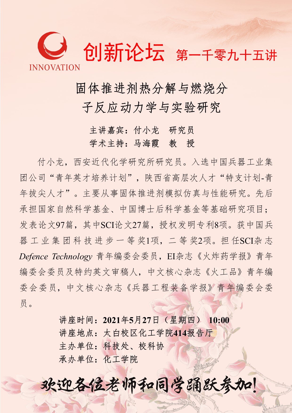 付小龙 研究员 必赢3003no1线路检测中心创新论坛第一千零九十五讲:固体推进剂热分解与燃烧分子反应动力学与实验研究 讲座时间 2021年5月27日(星期四) 10:00 讲座地点 太白校区化工学院414报告厅 讲座人介绍 付小龙 研究员 讲座内容