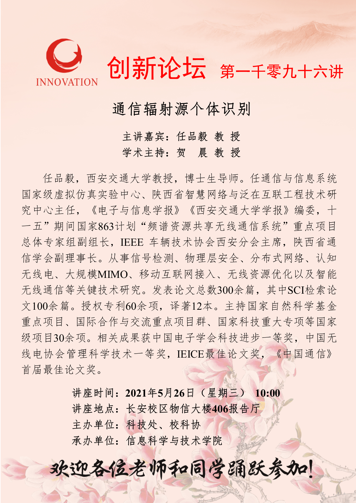 任品毅 教 授 必赢3003no1线路检测中心创新论坛第一千零九十六讲:通信辐射源个体识别 讲座时间 2021年5月26日(星期三) 10:00 讲座地点 长安校区物信大楼406报告厅 讲座人介绍 任品毅 教 授 讲座内容