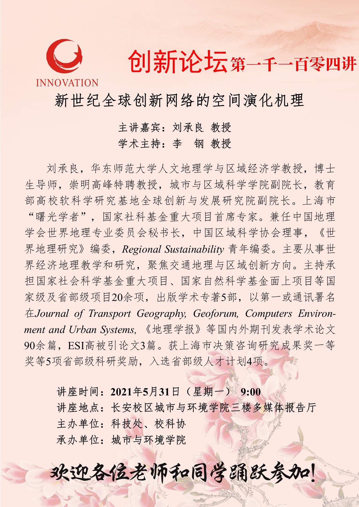 刘承良 教授 必赢3003no1线路检测中心创新论坛第一千一百零四讲:新世纪全球创新网络的空间演化机理 讲座时间 2021年5月31日(星期一) 9:00 讲座地点 长安校区城市与环境学院三楼多媒体报告厅 讲座人介绍 刘承良 教授 讲座内容