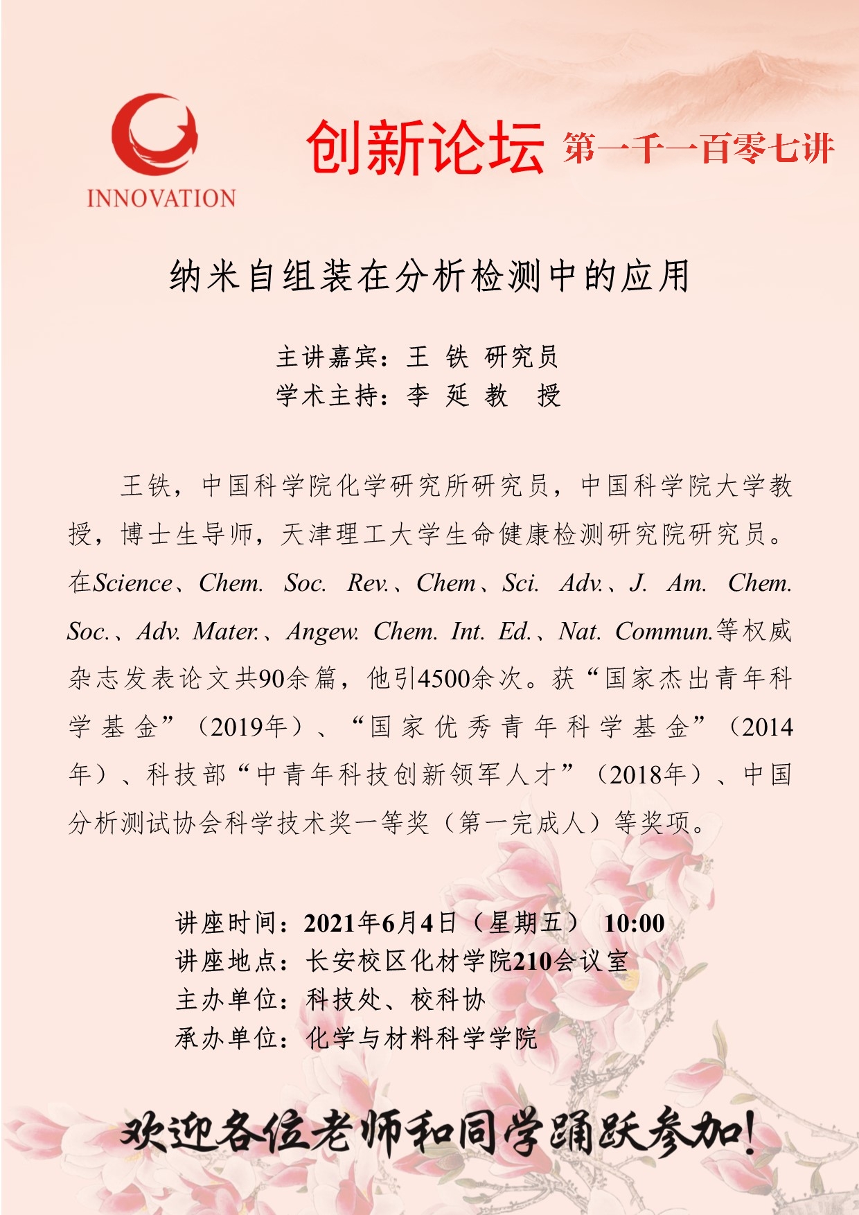 王 铁 研究员 必赢3003no1线路检测中心创新论坛第一千一百零七讲:纳米自组装在分析检测中的应用 讲座时间 2021年6月4日(星期五) 10:00 讲座地点 长安校区化材学院210会议室 讲座人介绍 王 铁 研究员 讲座内容