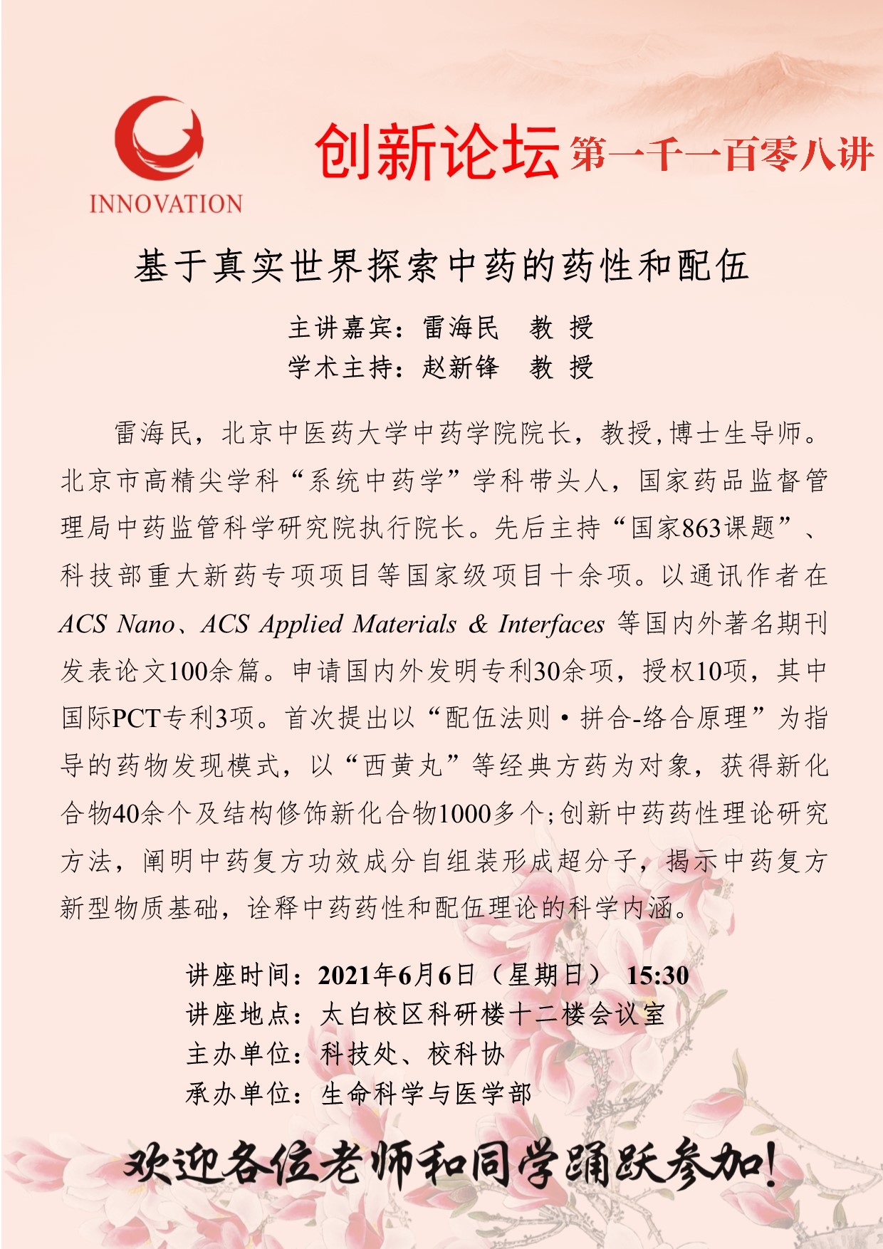 雷海民 教 授 必赢3003no1线路检测中心创新论坛第一千一百零八讲:基于真实世界探索中药的药性和配伍 讲座时间 2021年6月6日(星期日) 15:30 讲座地点 太白校区科研楼十二楼会议室 讲座人介绍 雷海民 教 授 讲座内容