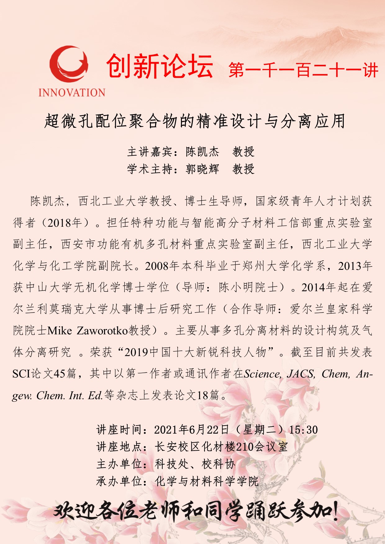 陈凯杰 教授 必赢3003no1线路检测中心创新论坛第一千一百二十一讲:超微孔配位聚合物的精准设计与分离应用 讲座时间 2021年6月22日(星期二)15:30 讲座地点 长安校区化材楼210会议室 讲座人介绍 陈凯杰 教授 讲座内容