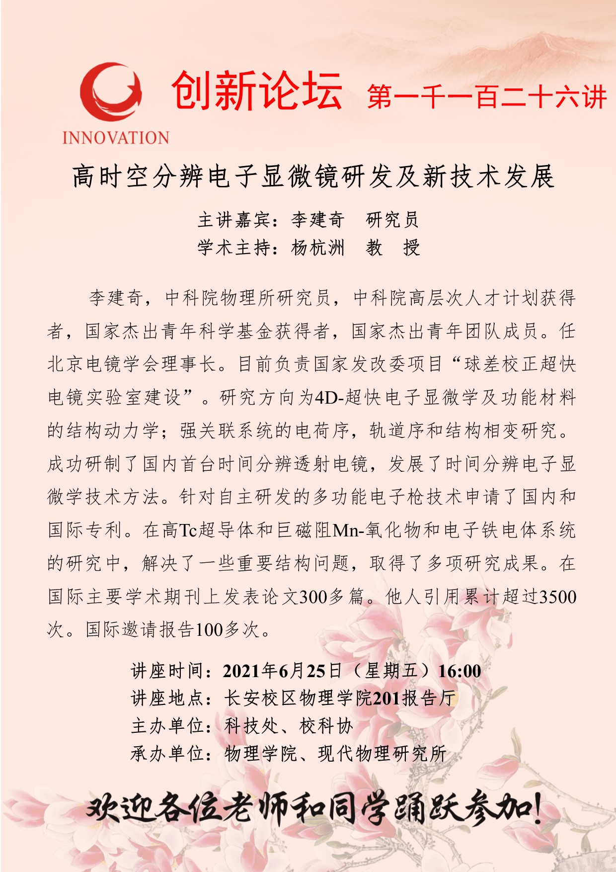 李建奇 研究员 必赢3003no1线路检测中心创新论坛第一千一百二十六讲:高时空分辨电子显微镜研发及新技术发展 讲座时间 2021年6月25日(星期五)16:00 讲座地点 长安校区物理学院201报告厅 讲座人介绍 李建奇 研究员 讲座内容