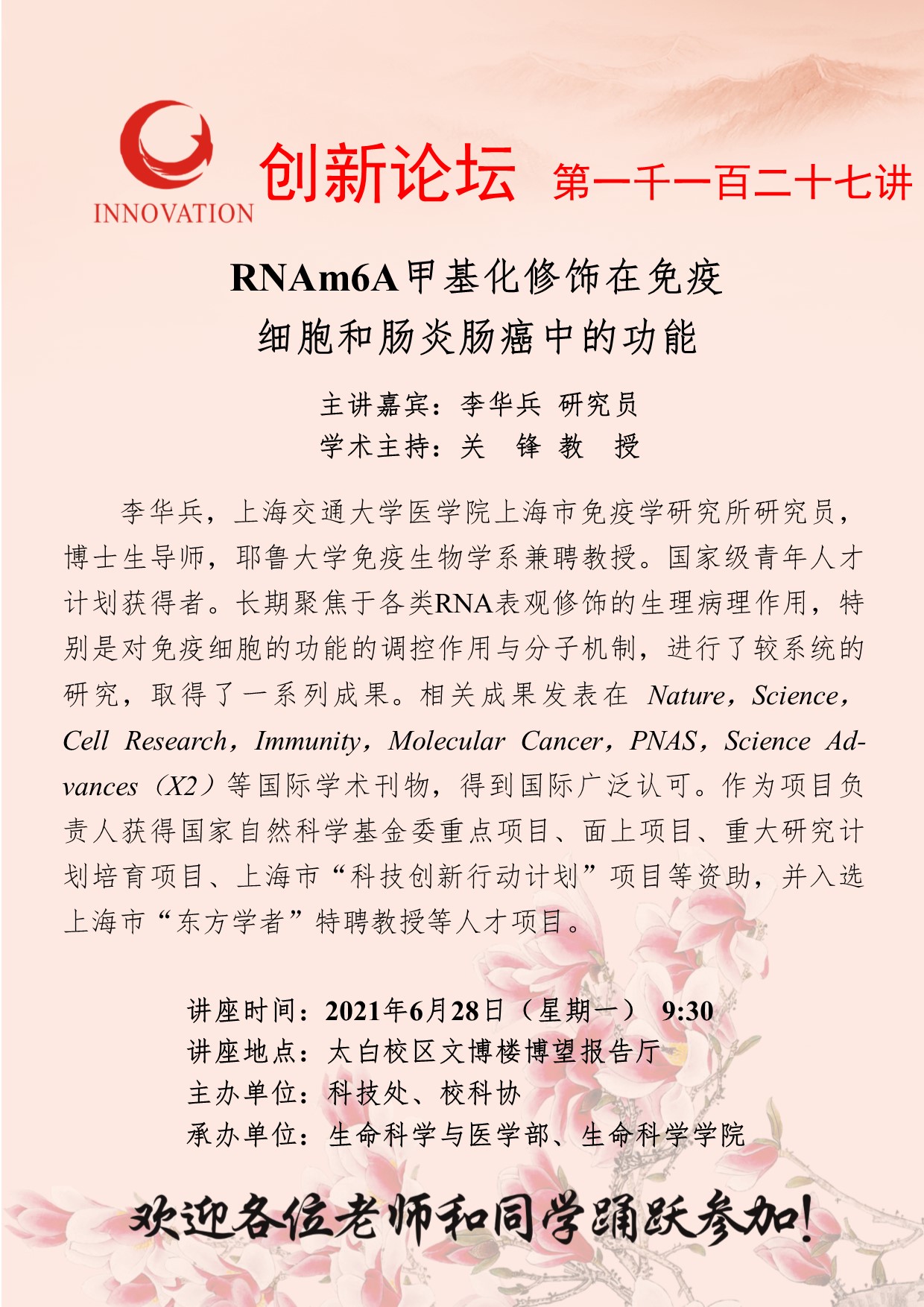 李华兵 研究员 必赢3003no1线路检测中心创新论坛第一千一百二十七讲:RNAm6A甲基化修饰在免疫细胞和肠炎肠癌中的功能 讲座时间 2021年6月28日(星期一) 9:30 讲座地点 太白校区文博楼博望报告厅 讲座人介绍 李华兵 研究员 讲座内容