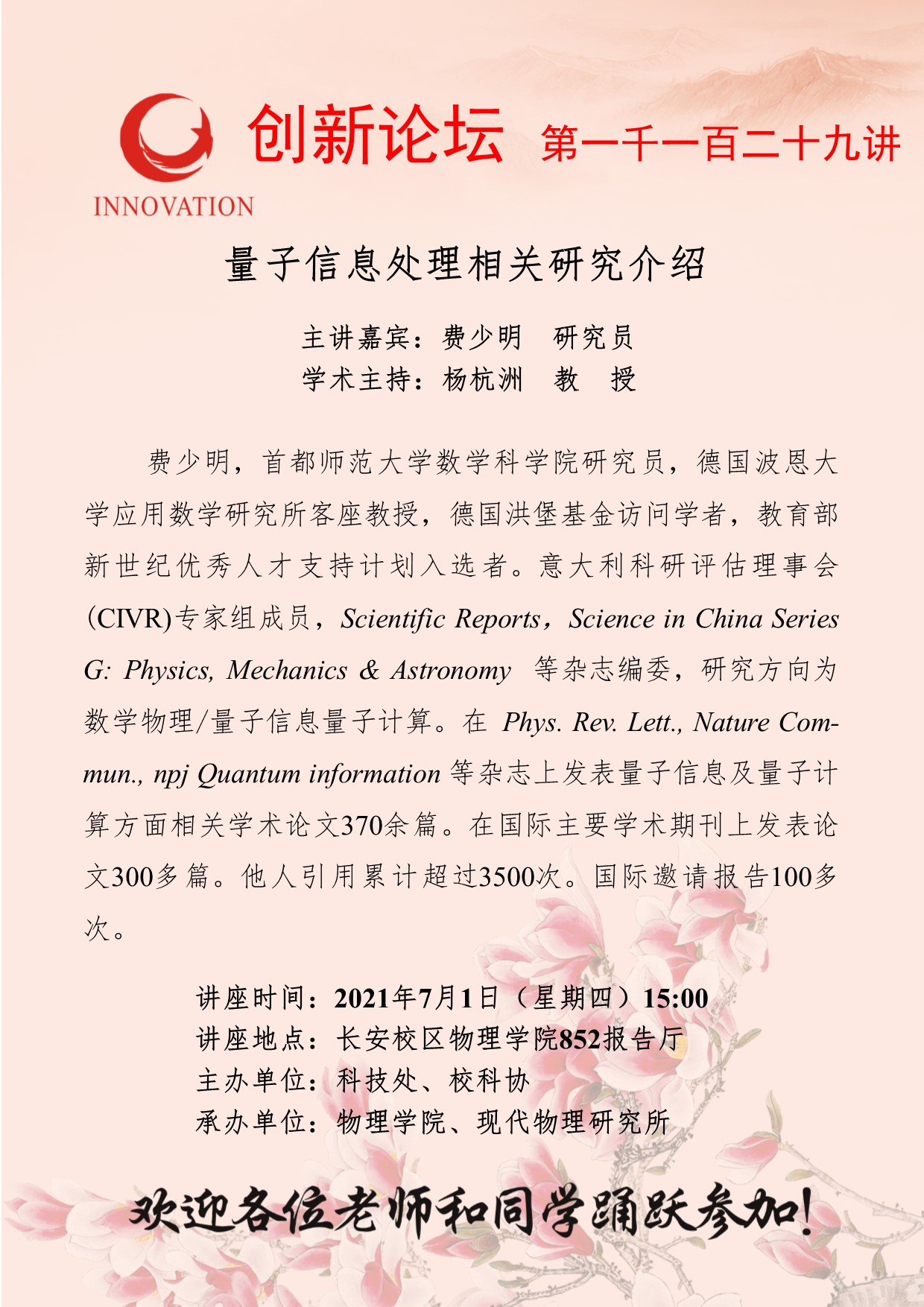 费少明 研究员 必赢3003no1线路检测中心创新论坛第一千一百二十九讲:量子信息处理相关研究介绍 讲座时间 2021年7月1日(星期四)15:00 讲座地点 长安校区物理学院852报告厅 讲座人介绍 费少明 研究员 讲座内容