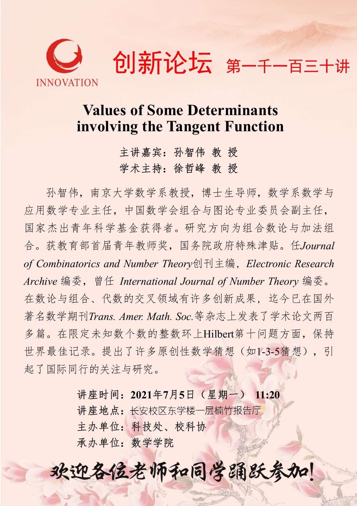 孙智伟 教 授 必赢3003no1线路检测中心创新论坛第一千一百三十讲:Values of Some Determinants involving the Tangent Function 讲座时间 2021年7月5日(星期一) 11:20 讲座地点 长安校区东学楼一层楠竹报告厅 讲座人介绍 孙智伟 教 授 讲座内容