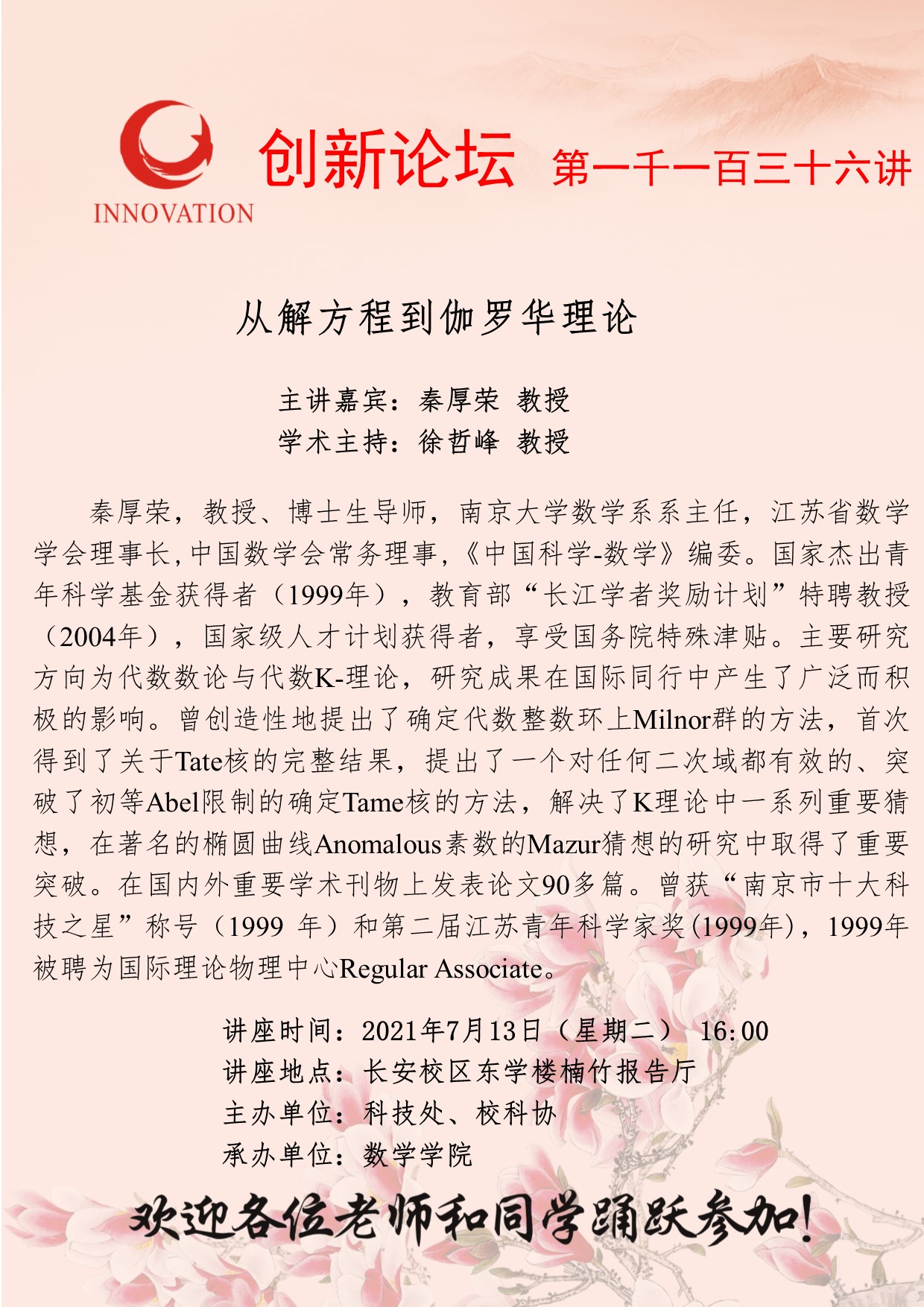 秦厚荣 教授 必赢3003no1线路检测中心创新论坛第一千一百三十六讲:从解方程到伽罗华理论 讲座时间 2021年7月13日 (星期二)16:00 讲座地点 长安校区东学楼楠竹报告厅 讲座人介绍 秦厚荣 教授 讲座内容